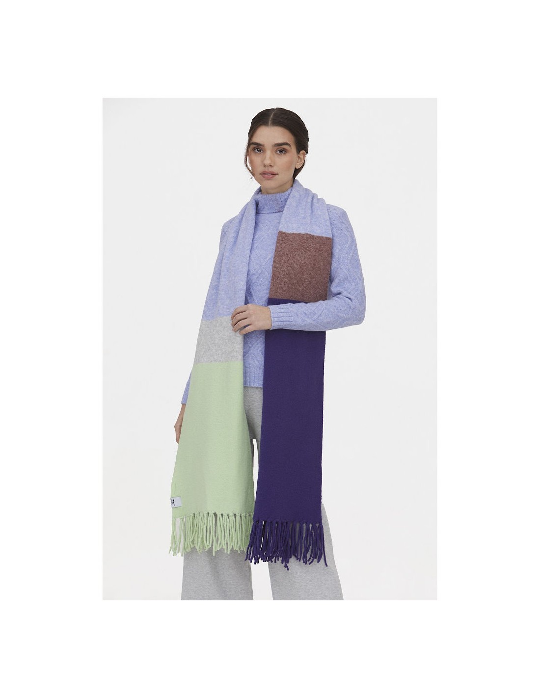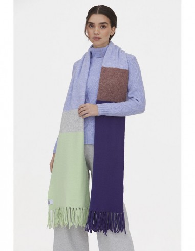 Bufanda multicolor con variedad de tonalidades que tiene armonía entre ellas. como detalle tiene flecos en el mismo color que las terminaciones.