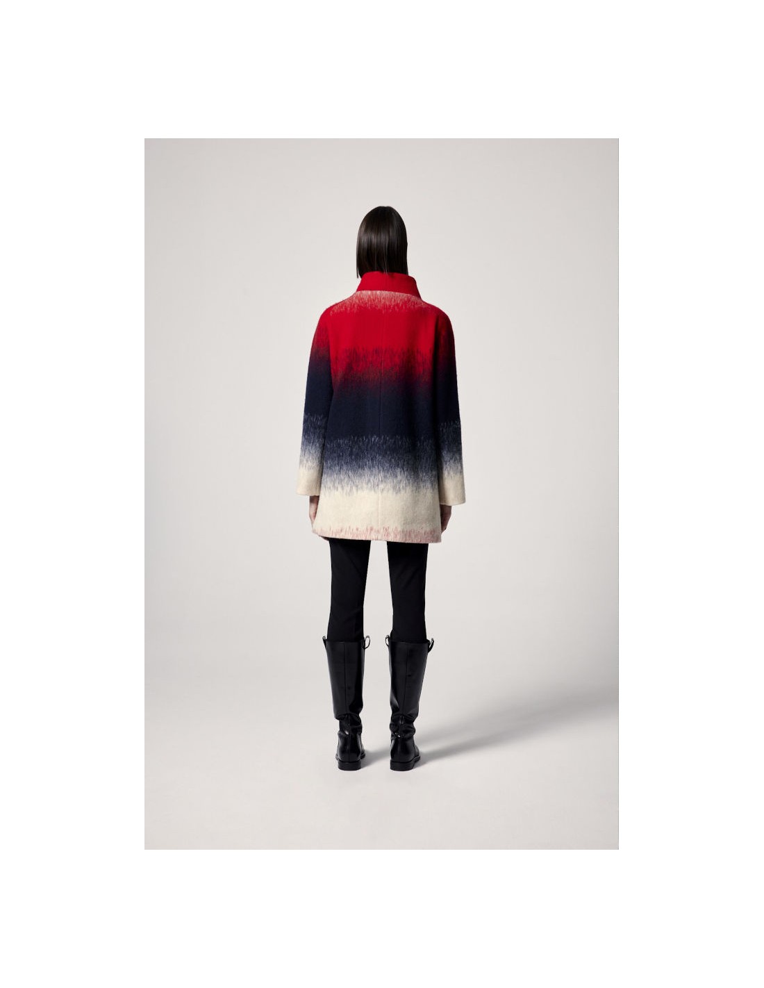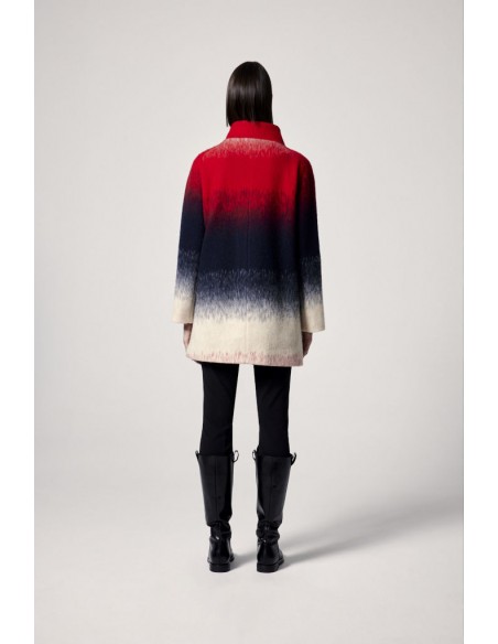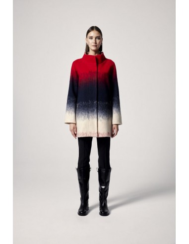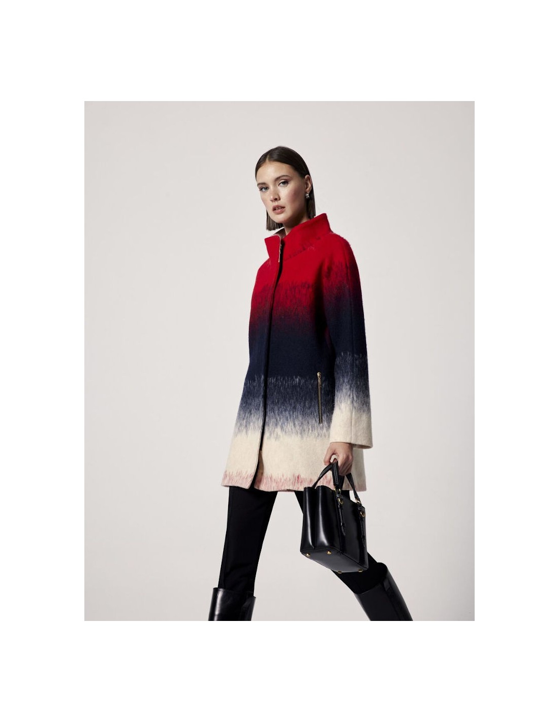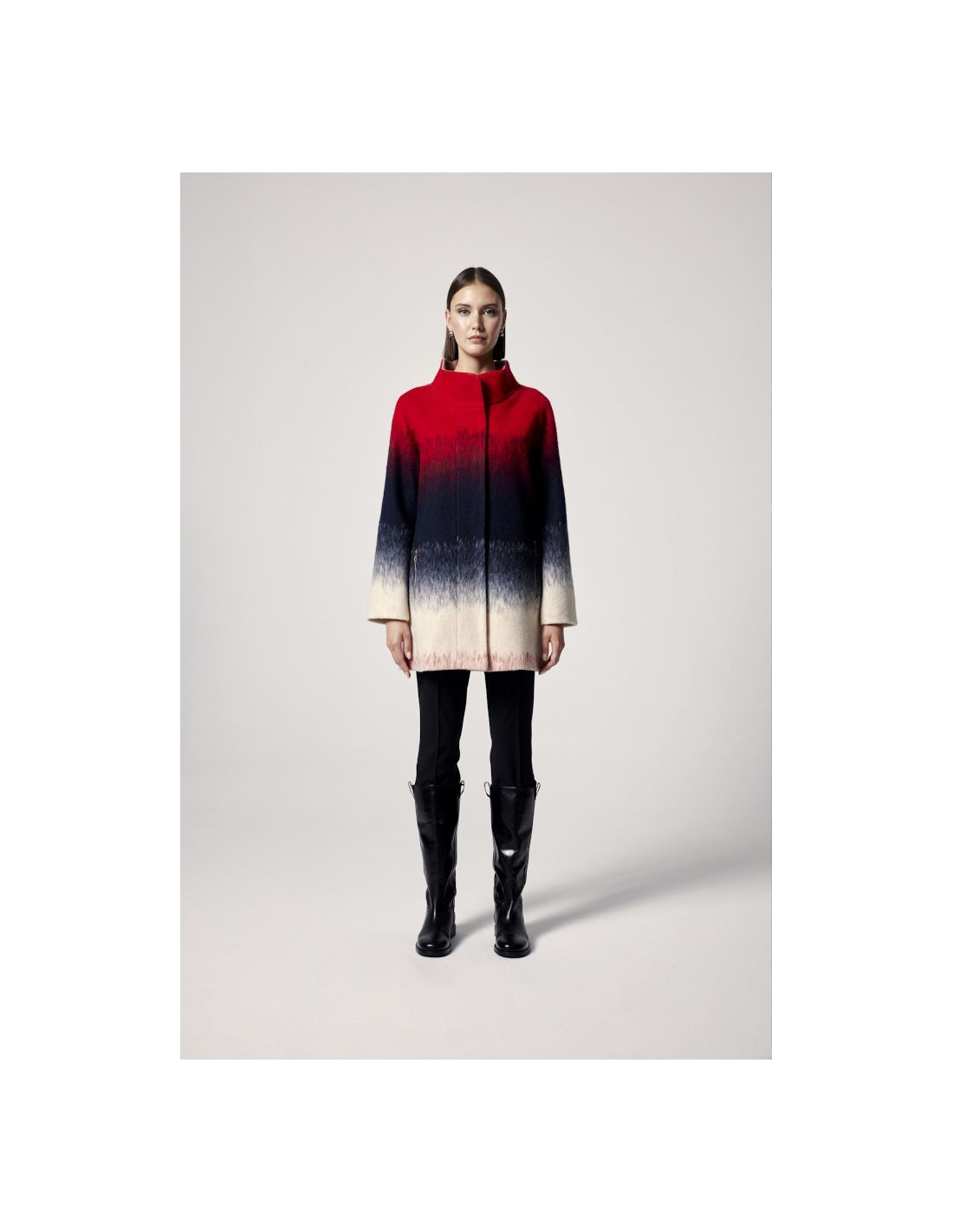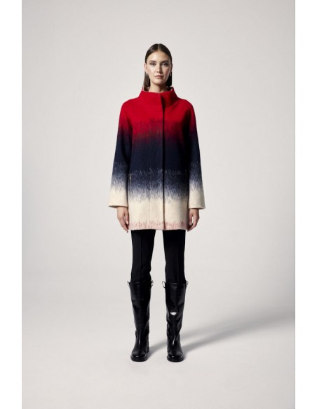 Abrigo de paño con cremallera tapada por una solapa y cuello subido. Detalle de degradado de colores pasando desde el rojo que lo encontramos en la parte de los hombros, al azul marino que lo encontramos en la zona del pecho hasta un poco más bajo de la cintura y el beige en el bajo. Dos bolsillos en la parte frontal con cierre de cremallera.