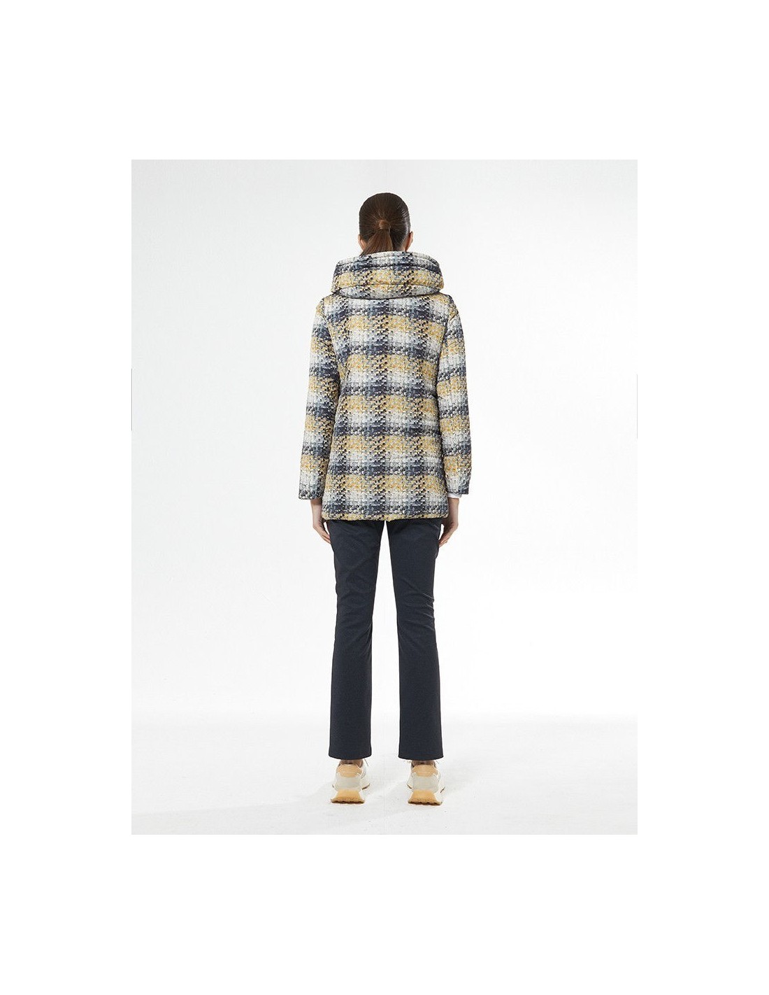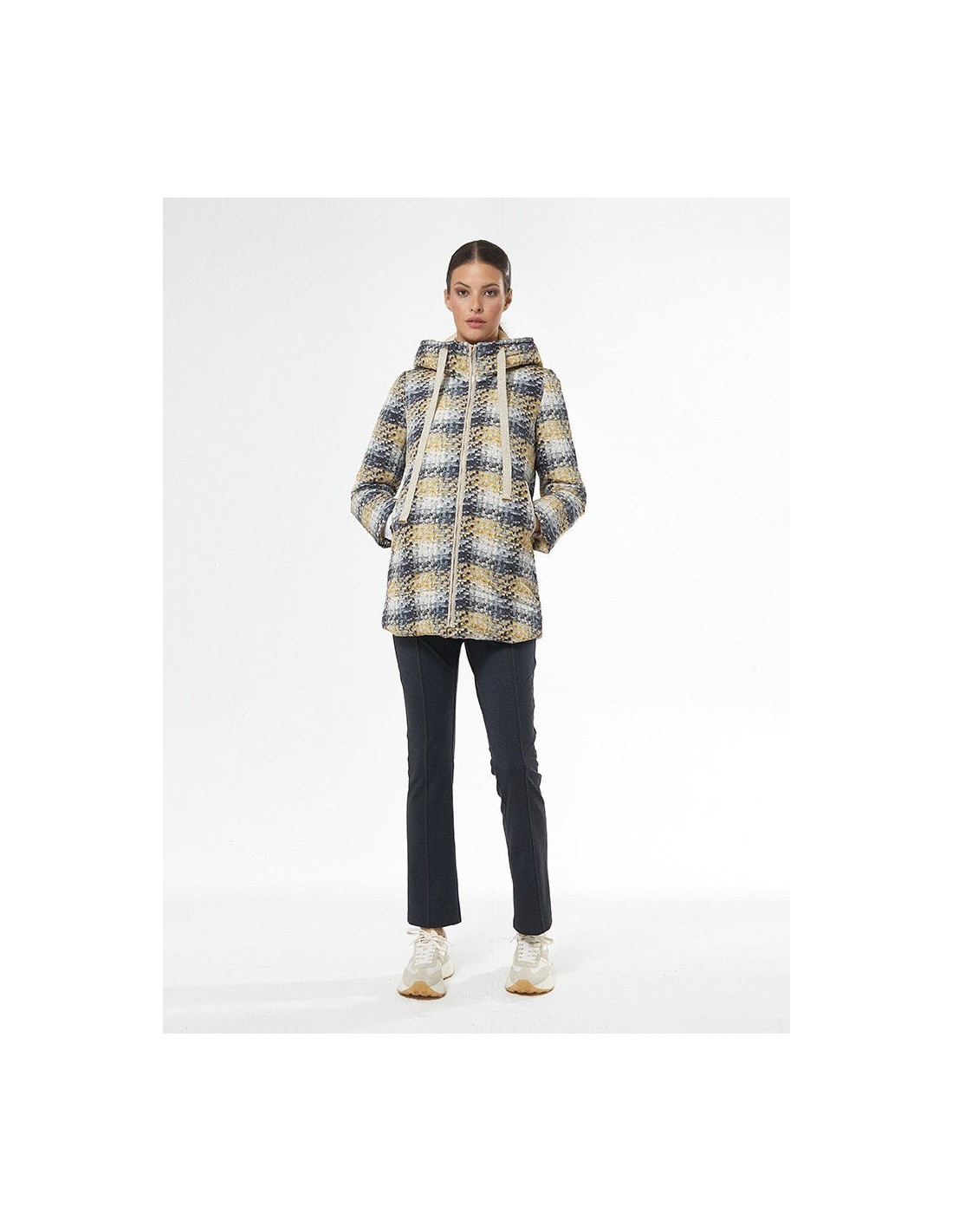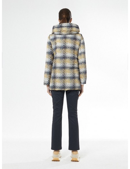 Parka con dibujo. Tiene capucha no desmontable. Con cremallera  con detalles en lurex dorado, Con bolsillos en la parte frontal con cierre de cremallera y cinta de ajuste de capucha visible también en lurex dorado.