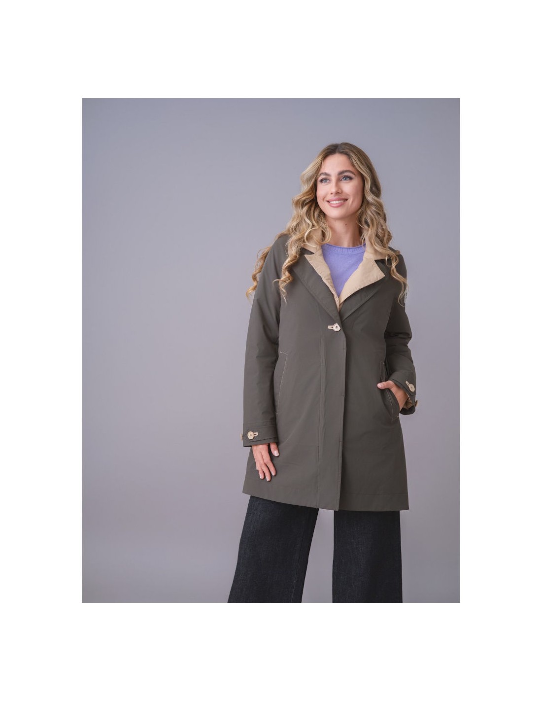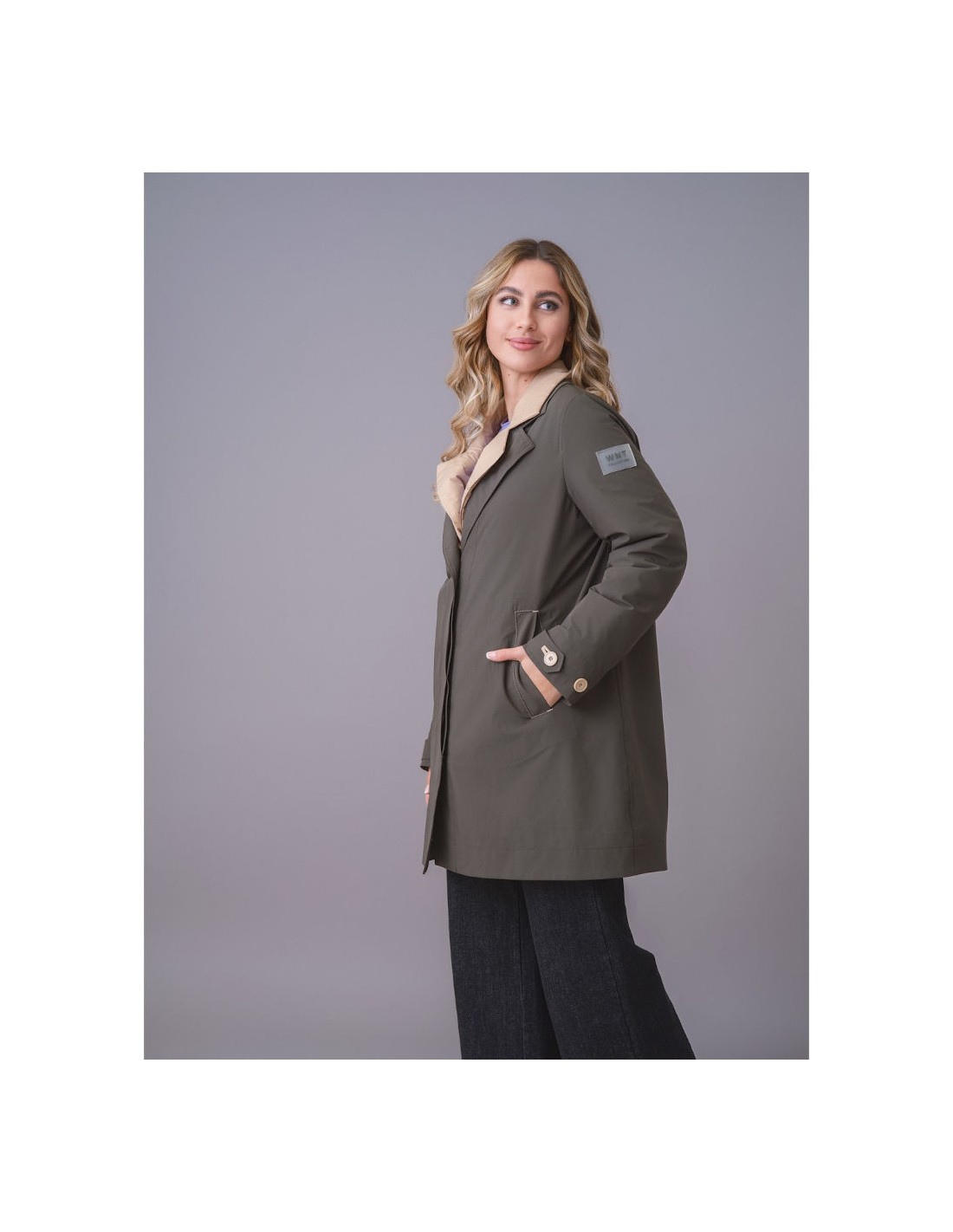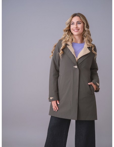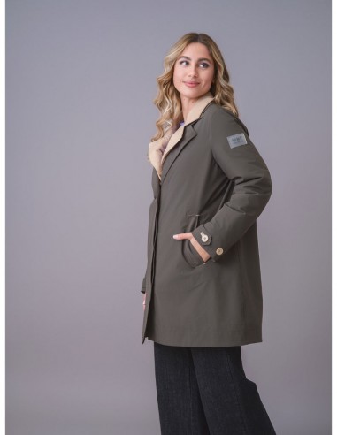 La parka que hace de cortavientos y que es la principal tiene el cuello en solapa abotonado en el centro con el detalle de una solapa que esconde casi todos los botones menos uno que se queda a la vista. Bolsillos en la parte frontal sin cremallera ni corchete. En la manga tenemos como detalle dos botones con presilla para poder ajustarlo mejor a la manga. Los botones en color crema. Tiene una pequeña abertura en el bajo de la parte trasera.