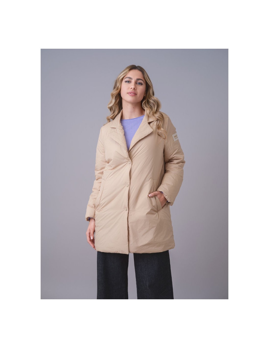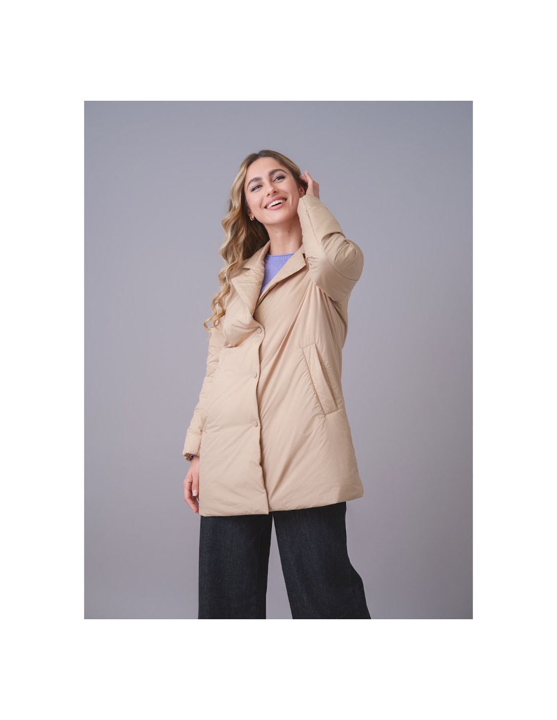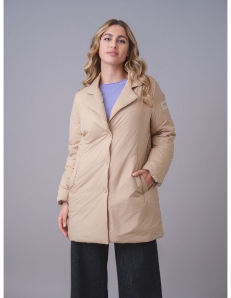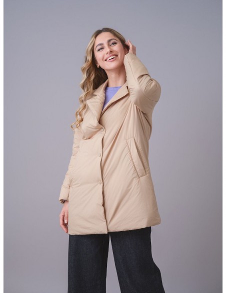 La parka esta combinada con un abrigo ligero guateado de cuello solapa en la parte interior abotonado en el centro con corchetes. Con bolsillos a ambos lados.