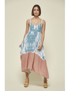Kimono tie dye. Tiene manga larga y es recto, en los laterales tiene dos aberturas, de tela fluida. Sin botones ni puntos de ajuste.