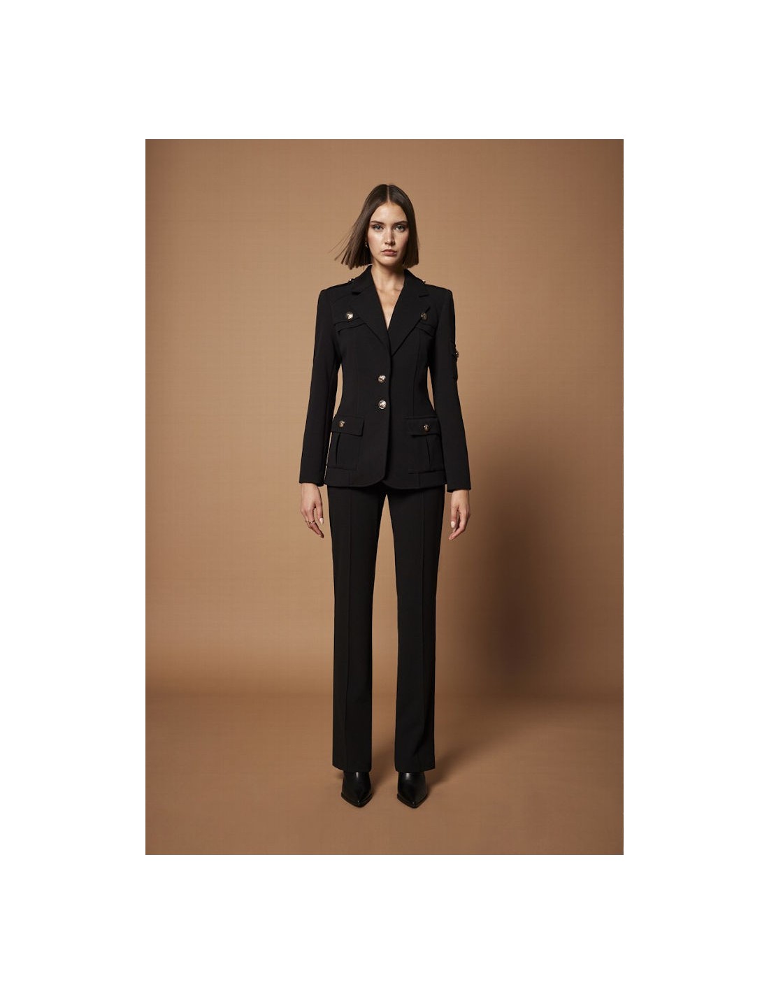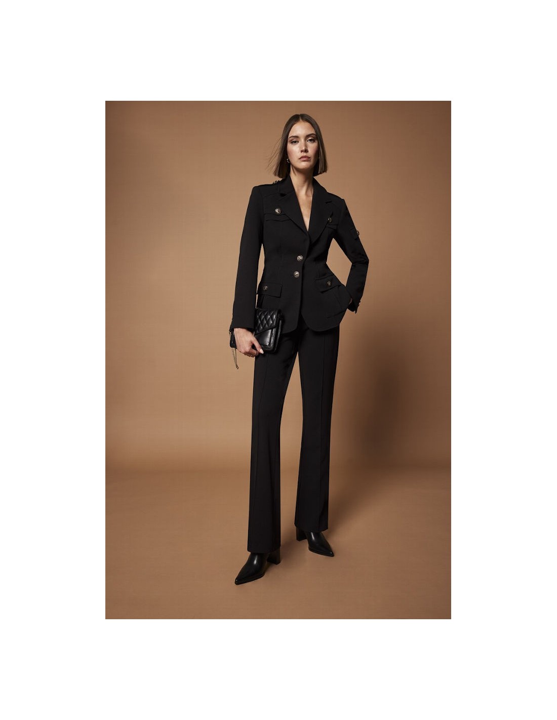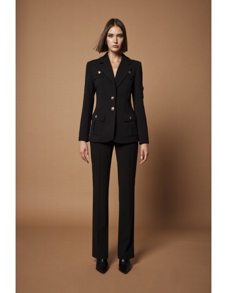 Pantalón es recto, con cremallera invisible, Tiene el detalle de una lazada en la parte frontal, con dos botones a ambos lados, iguales a los utilizados en la chaqueta.