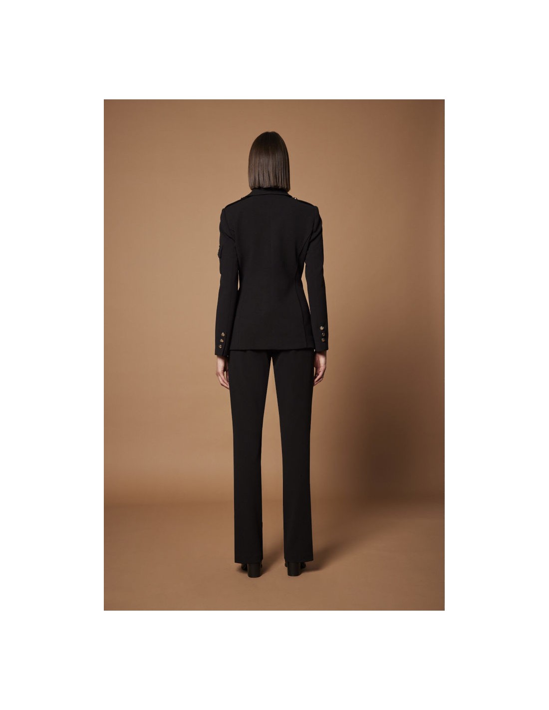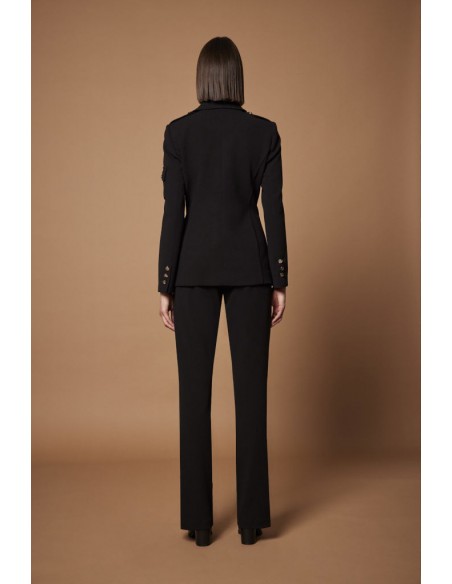 Chaqueta abotonada con botones dorados, estos los encuentras también en hombros. pecho y mangas. Con cuello solapa. Detalle de dos bolsillos en la parte frontal, tiene también un bolsillo pequeño en el brazo izquierdo.