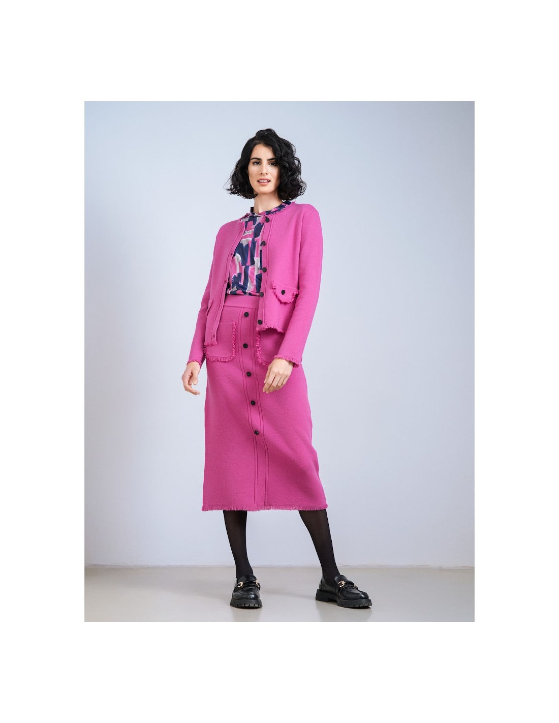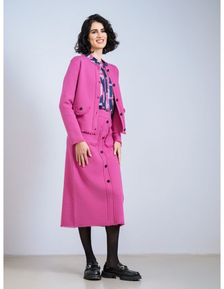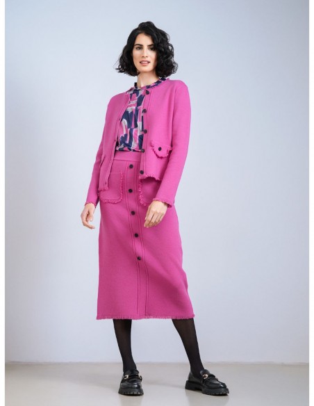 Falda con cintura engomada. Detalle de dos bolsillo en la parte delantera con los mismos botones que la chaqueta en el centro de la falda. Tiene el mismo desflecado en bolsillos y bajo que la chaqueta. Recta.