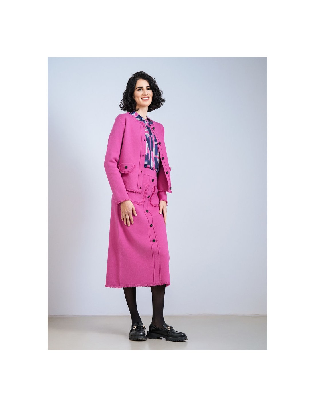 Chaqueta de punto con cuello redondo. Abotonada con botones en color marrón. Tiene dos falsos bolsillos en la parte delantera. Detalle de cuello, puños, bajo y bolsillos desflecados.