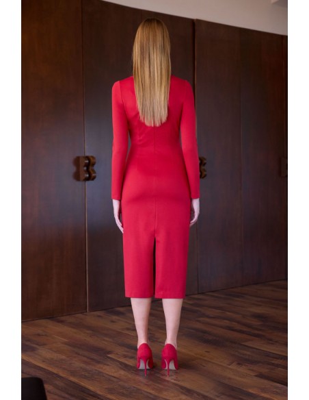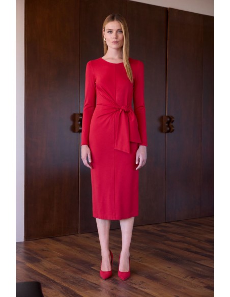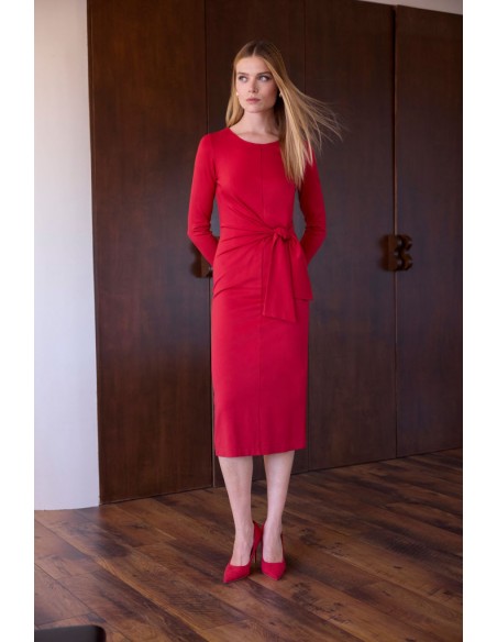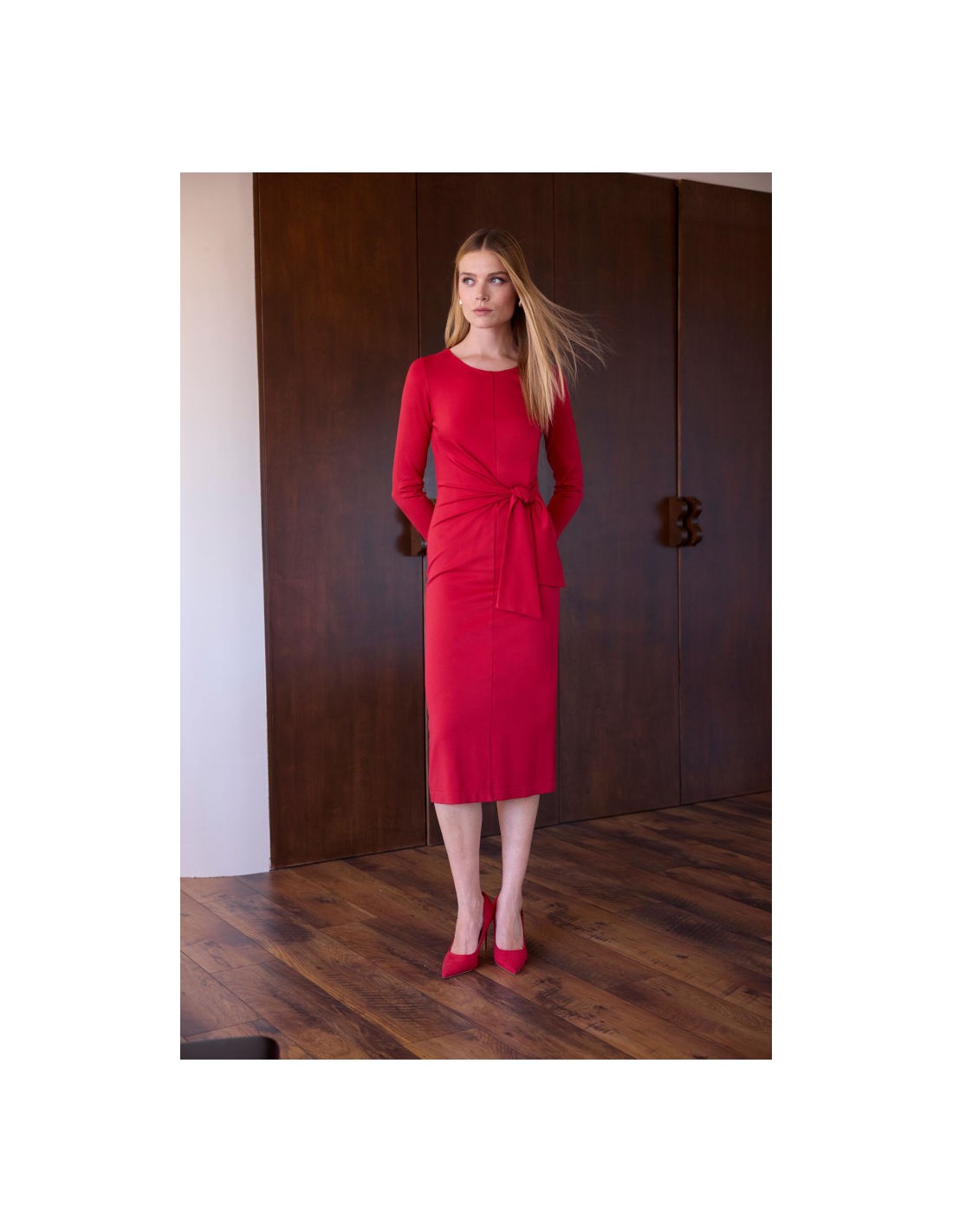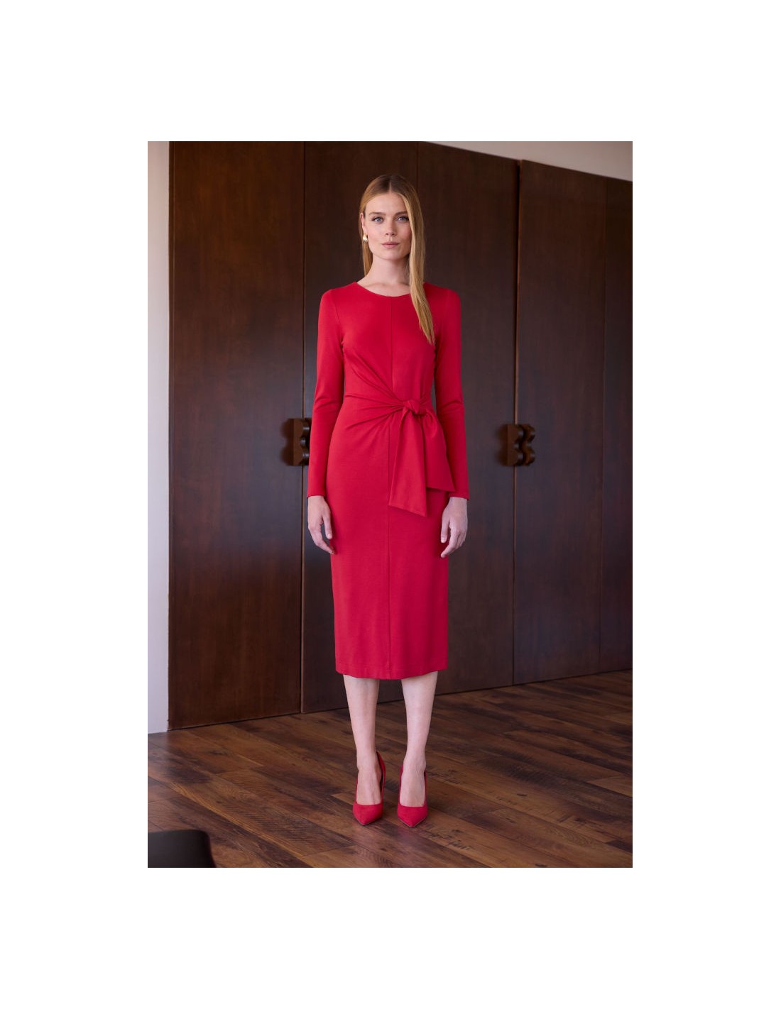 Vestido con cuello redondo. Manga larga. MIDI. Detalle del nudo en el lado izquierdos quedando fruncido también. Costura desde el cuello hasta el bajo. Tiene abertura en la parte trasera del bajo. Cierre de cremallera invisible. Tiene forro.