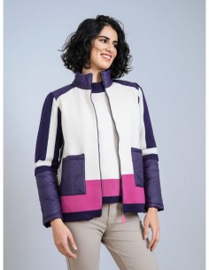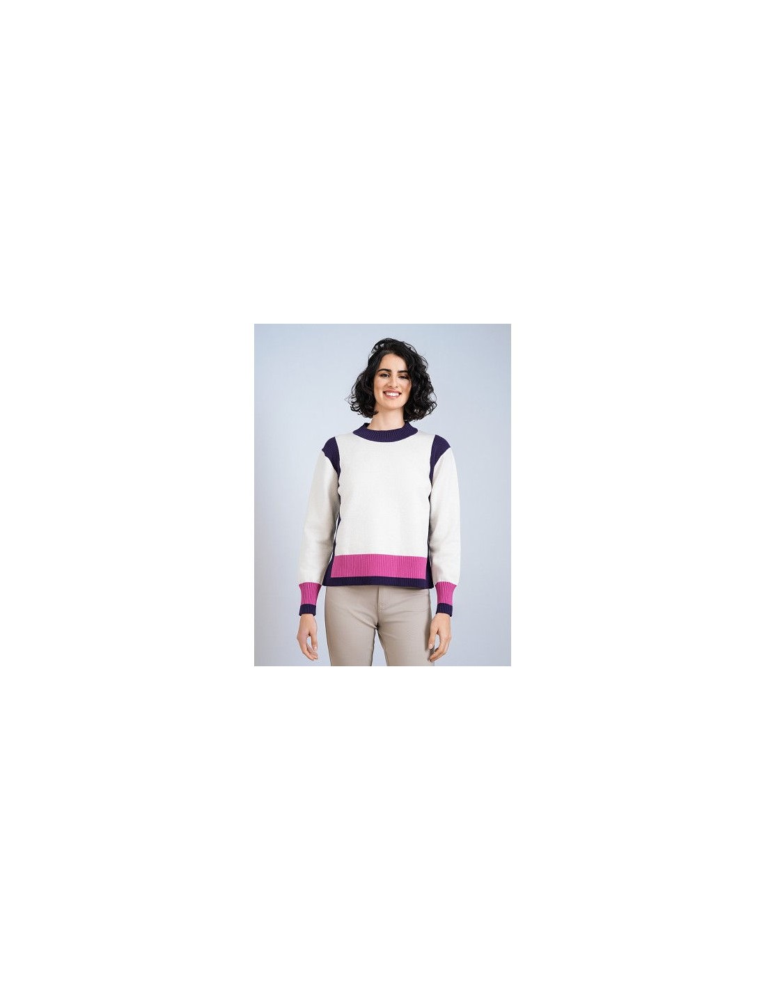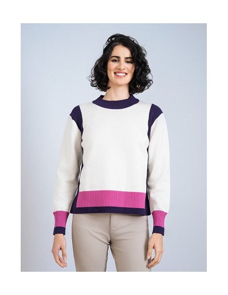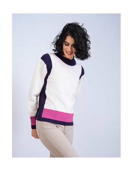 Jersey de cuello perkins. Este jersey tiene combinaciones de punto, siendo diferente en cuello, hombros, manga y bajo. Combinando los colores con armonía. Tiene aberturas en en bajo en ambos lados.