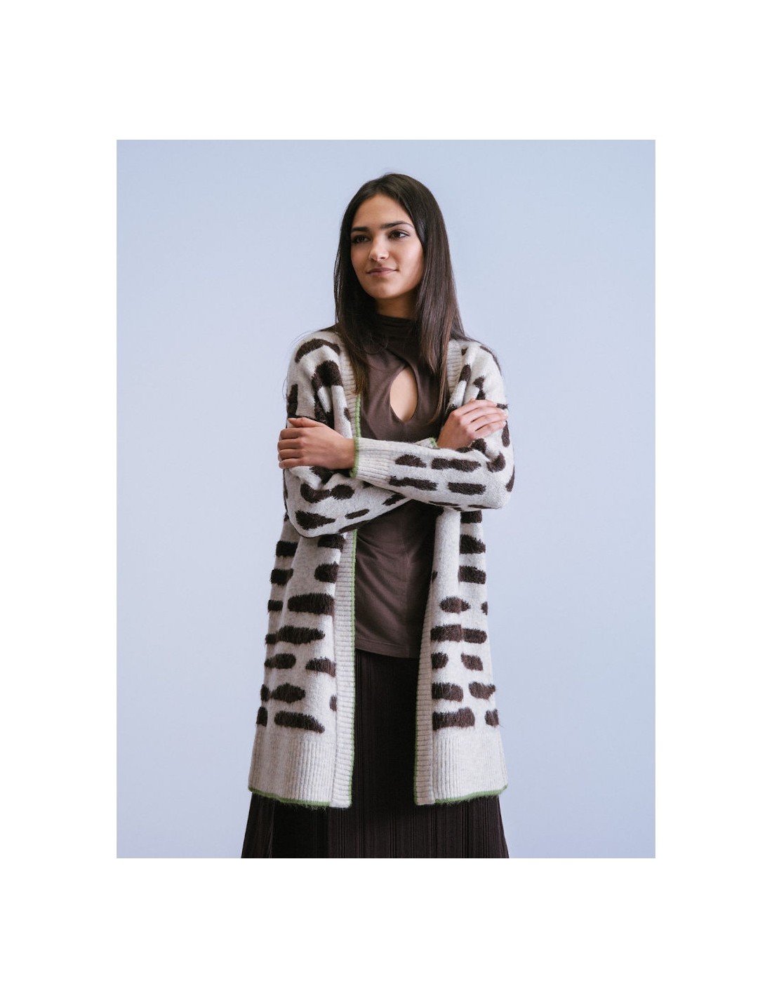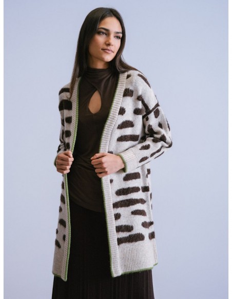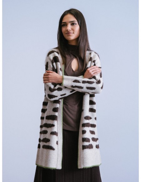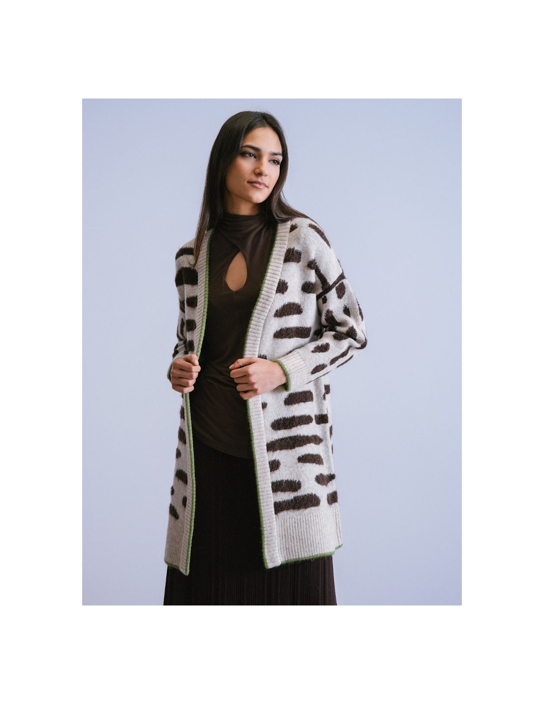Cárdigan de punto. Detalle de cambio de punto en el borde de la chaqueta al igual que en mangas y bajo. Con una línea fina en color verde por los bordes de la chaqueta. Detalle de relieves en las zonas marrones oscuras. Sin botones.