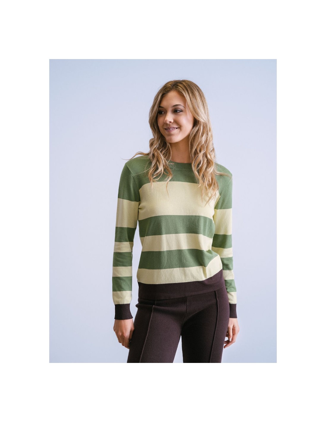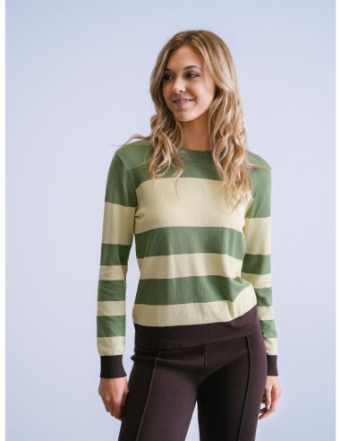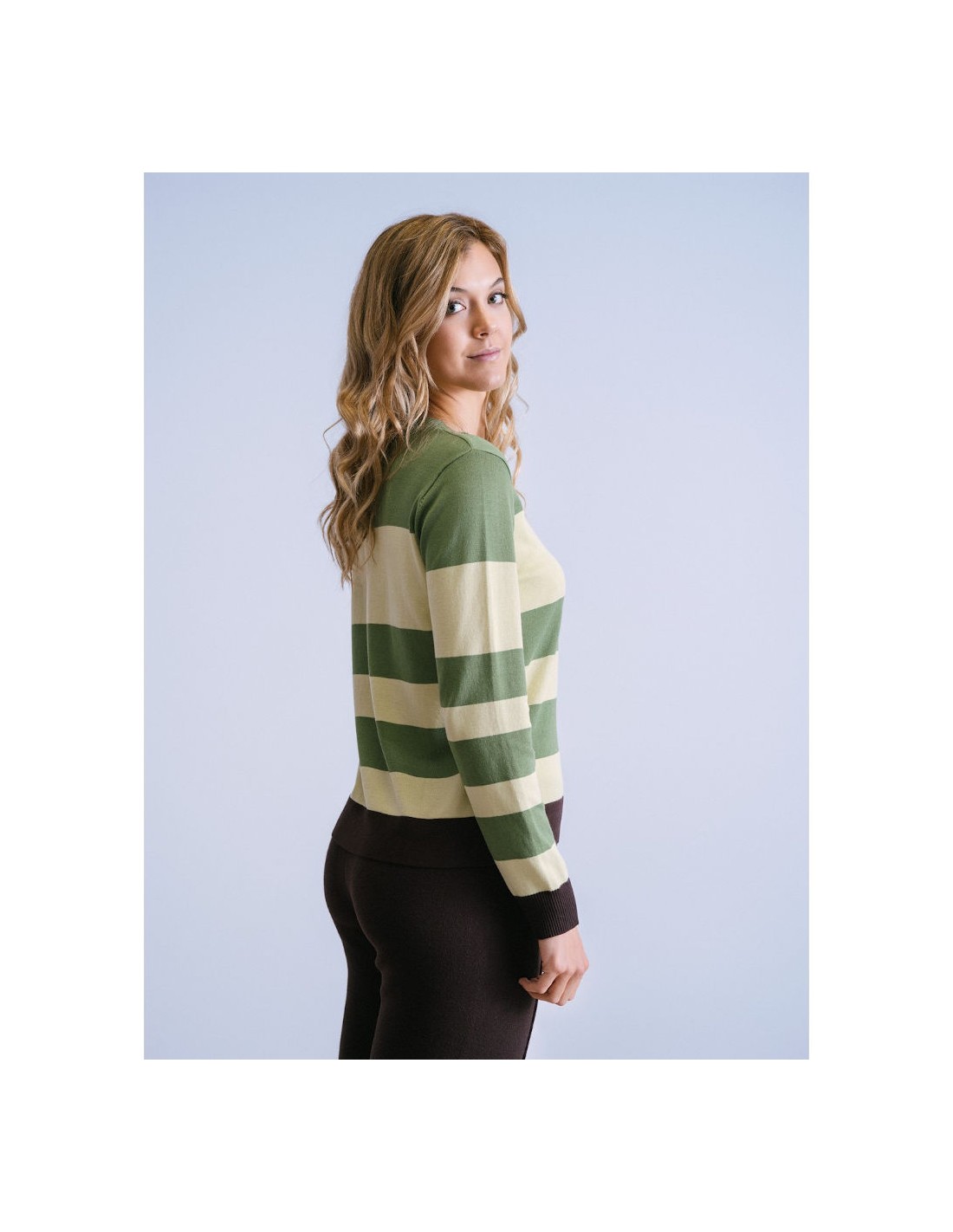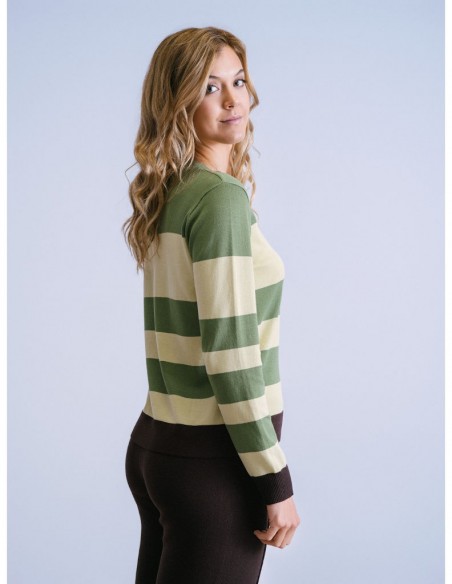 Jersey cuello caja. De rayas en tonalidades en verde con puño y bajos en marrón chocolate.