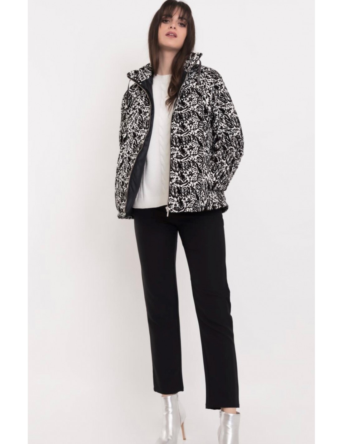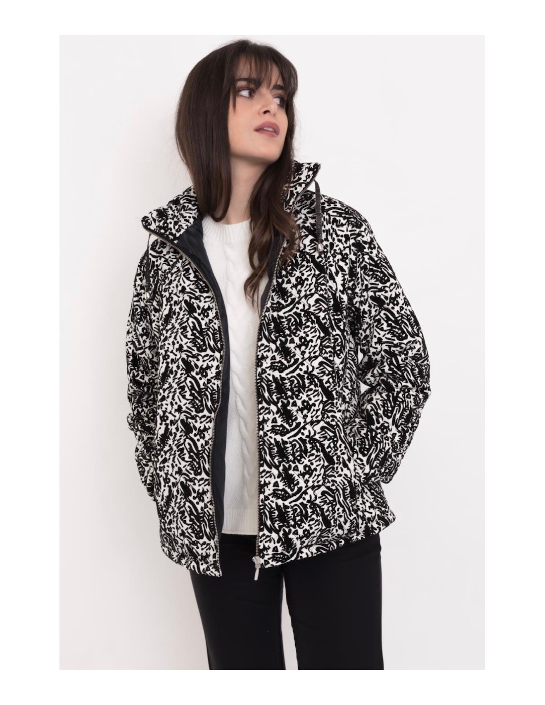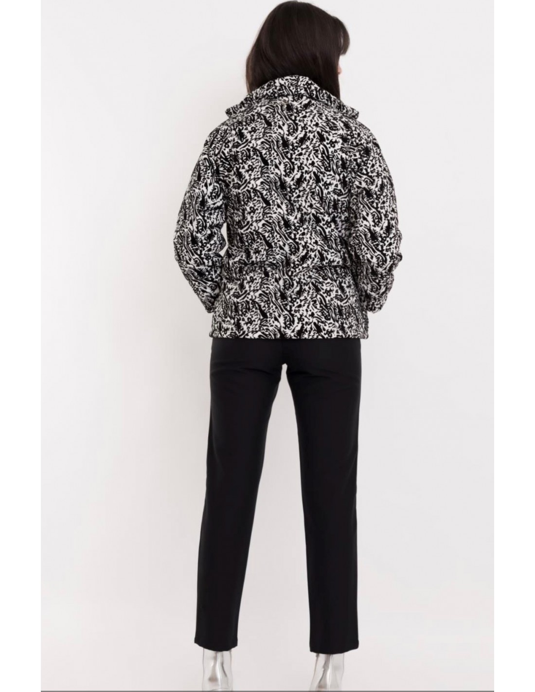 Cazadora estampada con bolsillos frontales, el cuello tiene como adorno una cinta. Abrochada únicamente con cremallera.