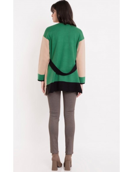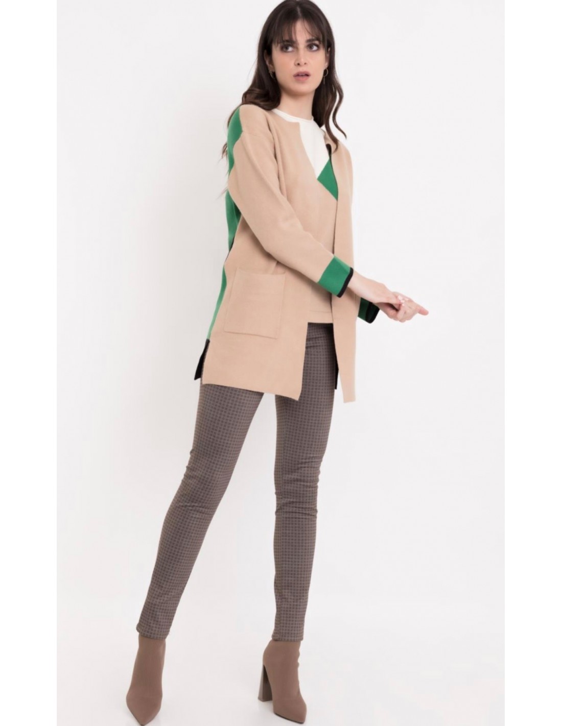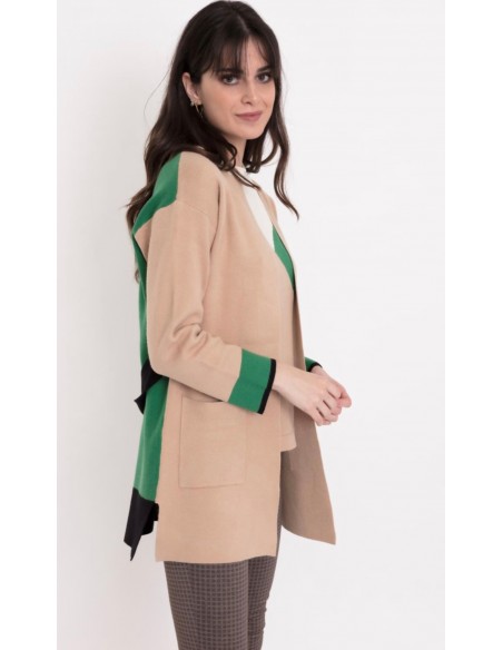 Cárdigan en tres colores sin botones con dos bolsillos frontales funcionales. Los detalles de la manga con el acabado en el puño con una franja verde y otra negra, la parte trasera cambia a color verde y lleva una tira simulando a un cinturón falso. Con dos aberturas en los laterales y el cambio de color nuevamente en el bajo de la prenda en negro.
