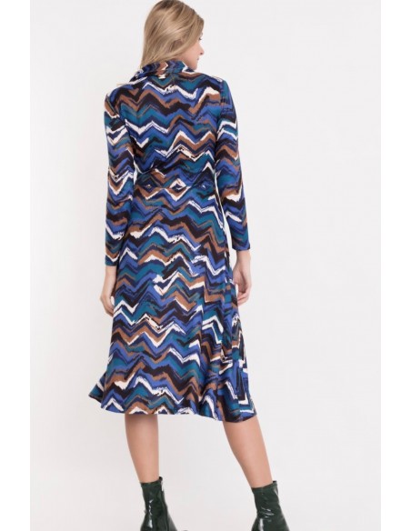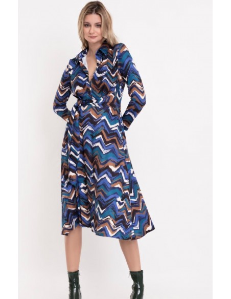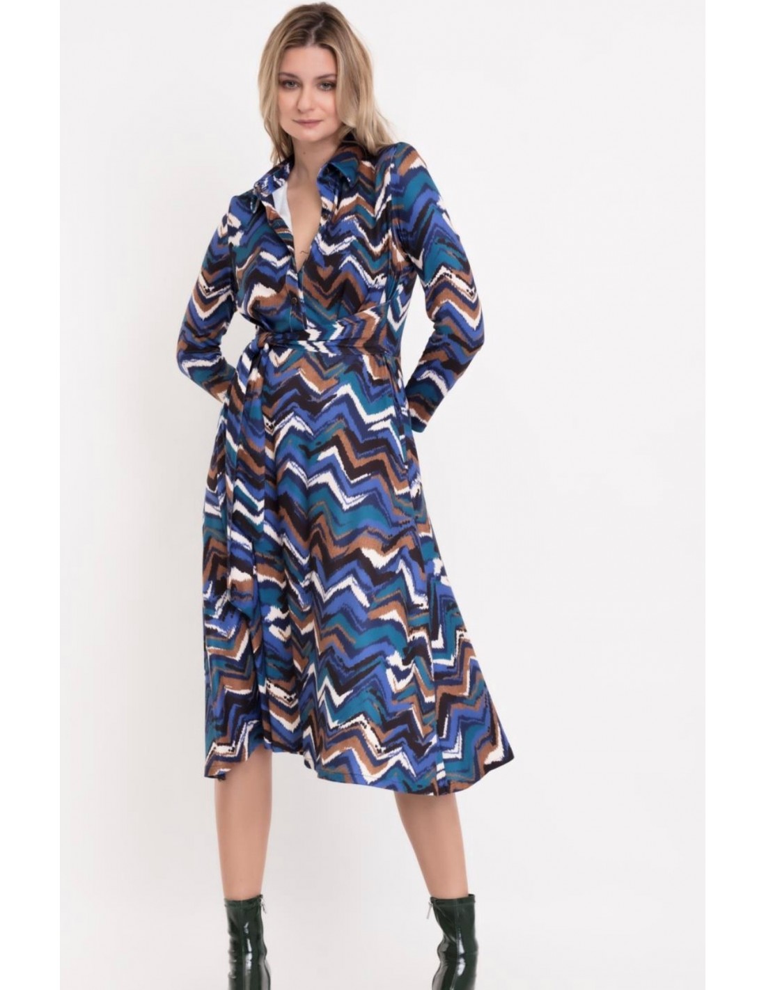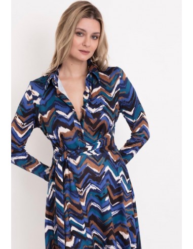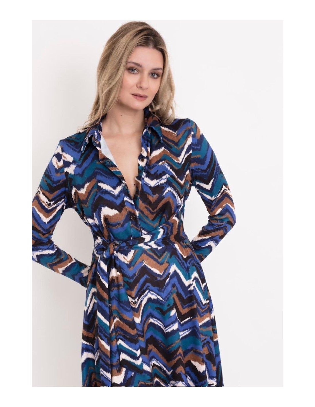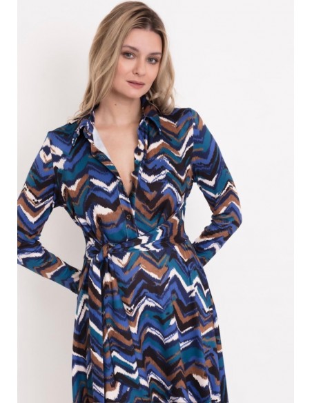 Vestido camisero con cuello de camisa clásico, abotonado hasta la cintura donde tiene un lazo como adorno con falda fluida. Estampado.