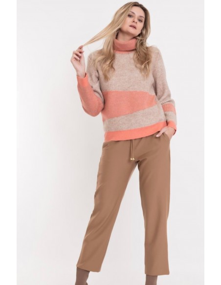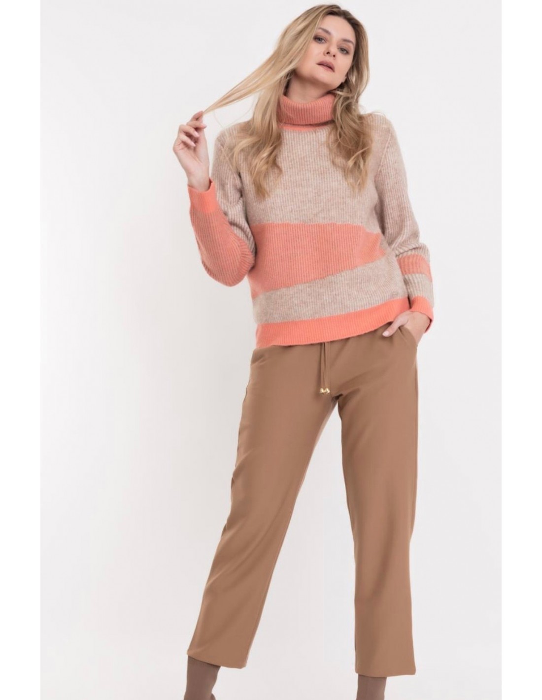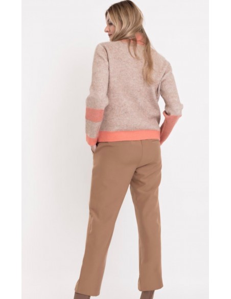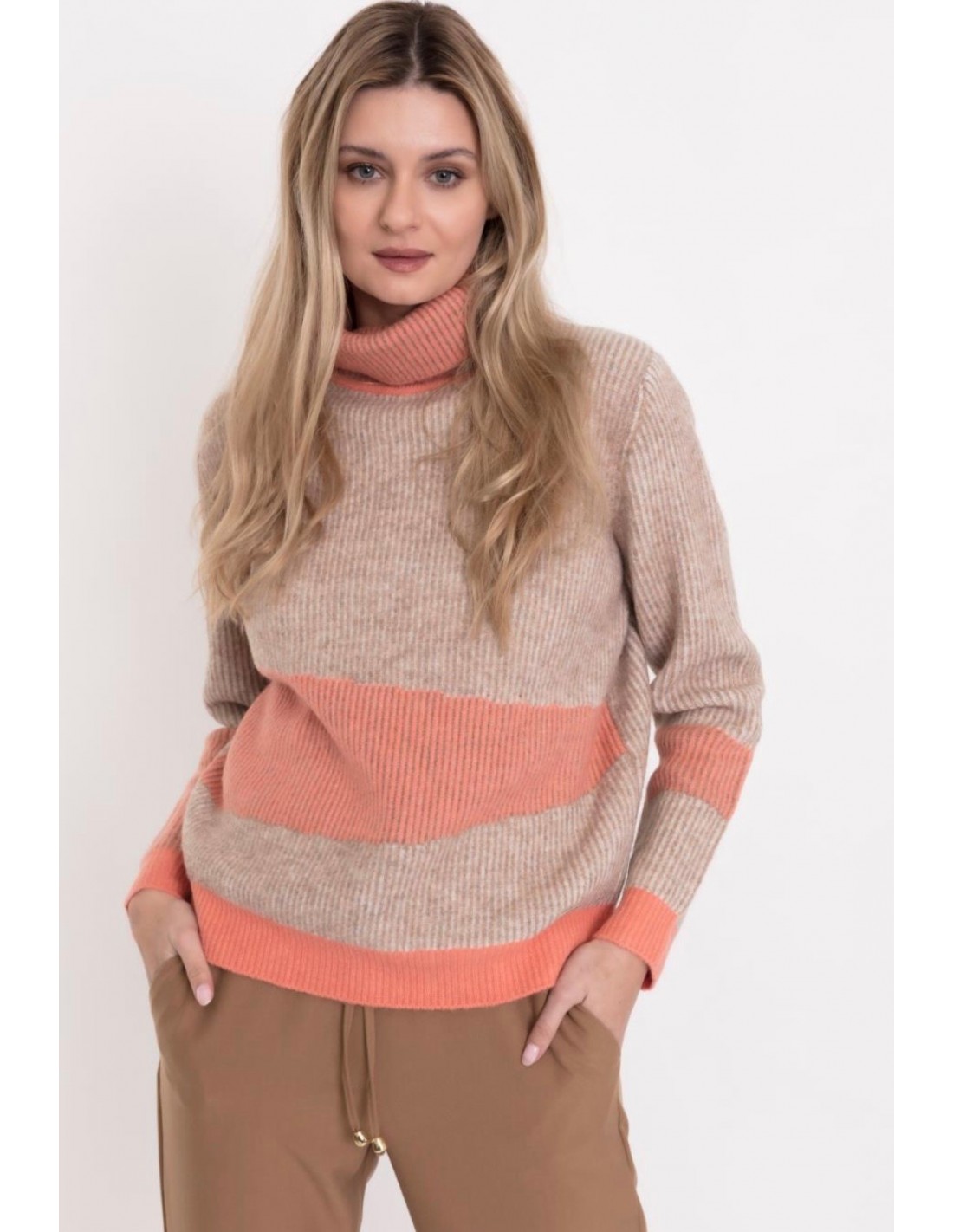 Jersey  de cuello alto. Con estampado de rayas en dos colores en la parte delantera y mangas, dejando la parte trasera en un solo color con el detalle de una franja en el bajo de otro color.