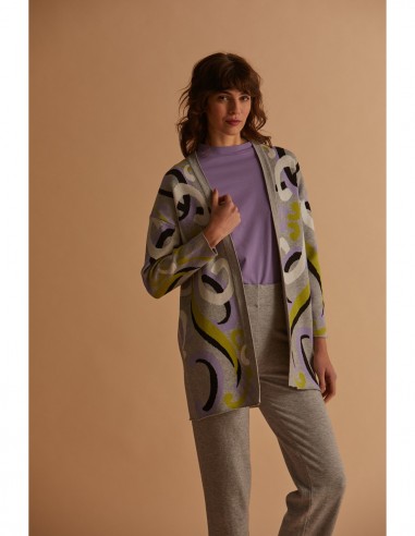 Chaqueta abierta sin cierre. Estampada en diferentes colores predominando el gris.