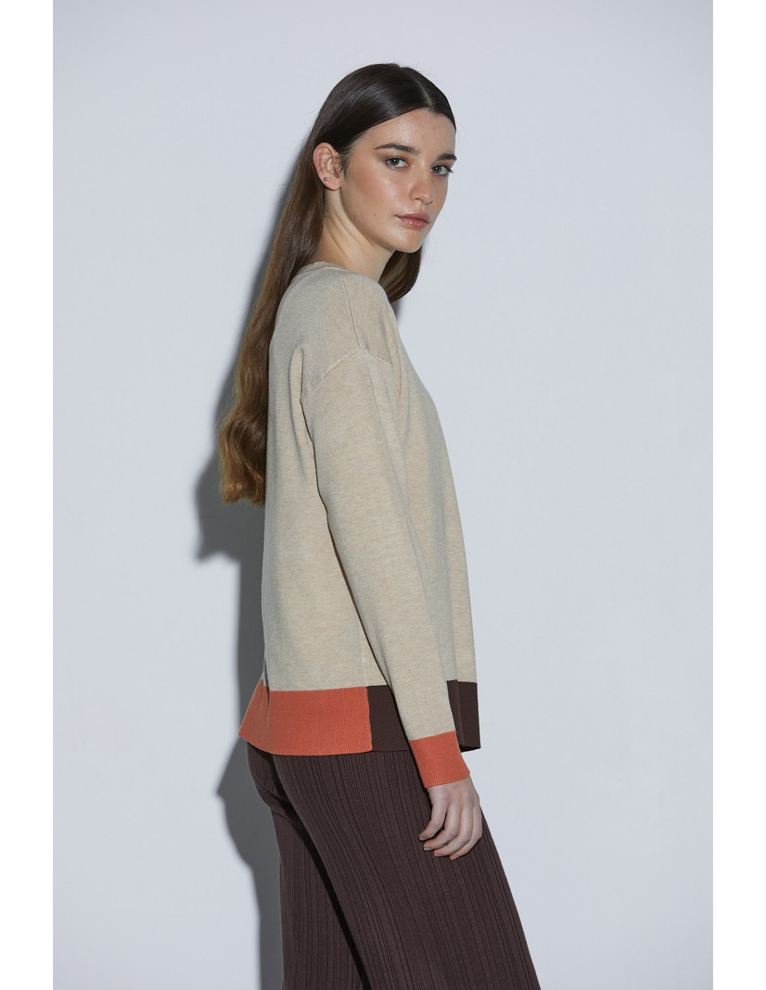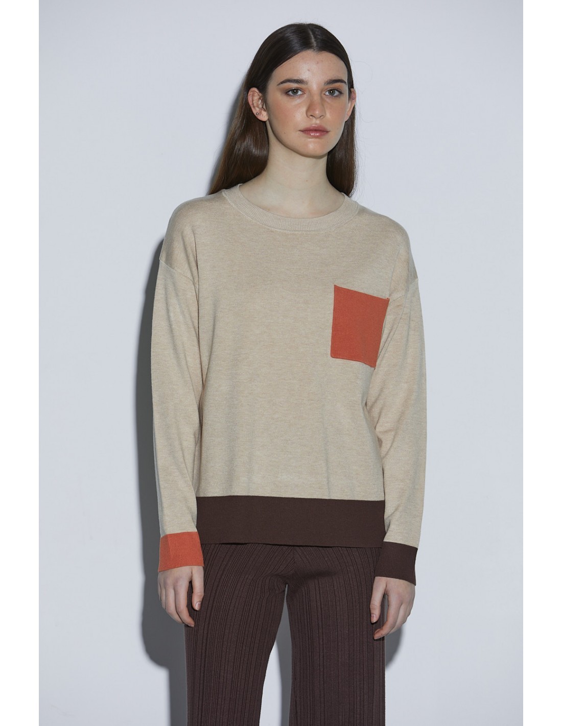 Jersey de cuello redondo. Con un bolsillo en la parte izquierda frontal de un color diferente al fondo del jersey, además los puños y bajos son también de diferentes colores.