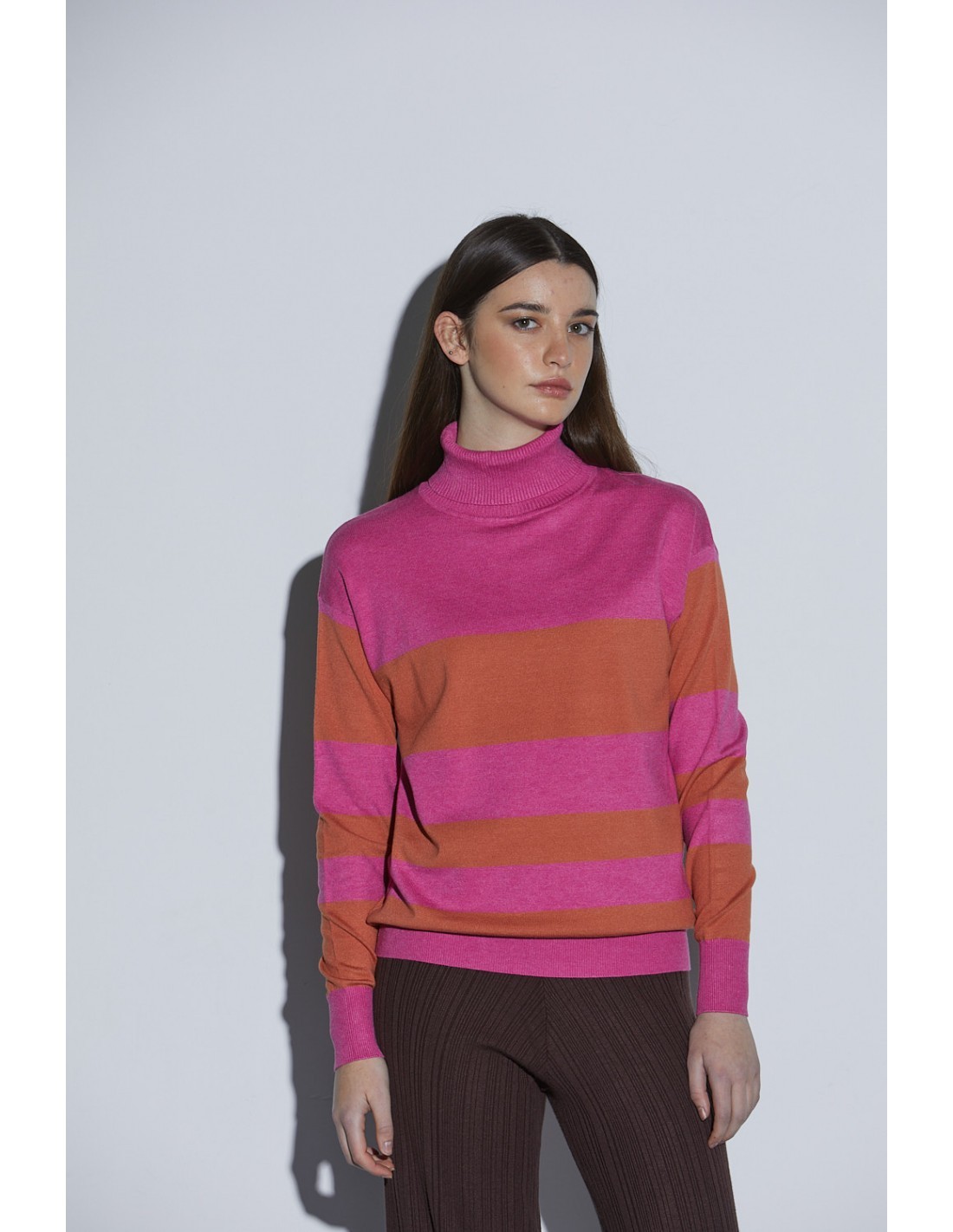 Jersey de cuello cisne, con rayas anchas que van en disminución de tamaño debajo las franjas más finas abajo.