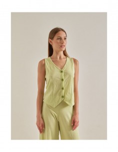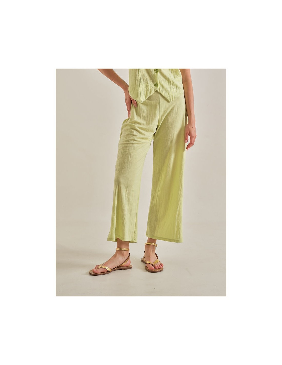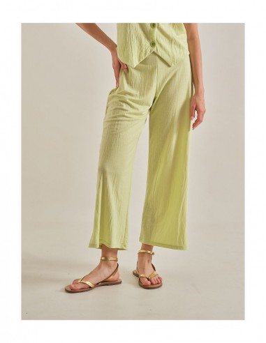 Pantalón con cintura engomada en la parte de atrás, mientras que en la parte delante tiene cinturilla. Pantalón recto y fluido. Sin forro.