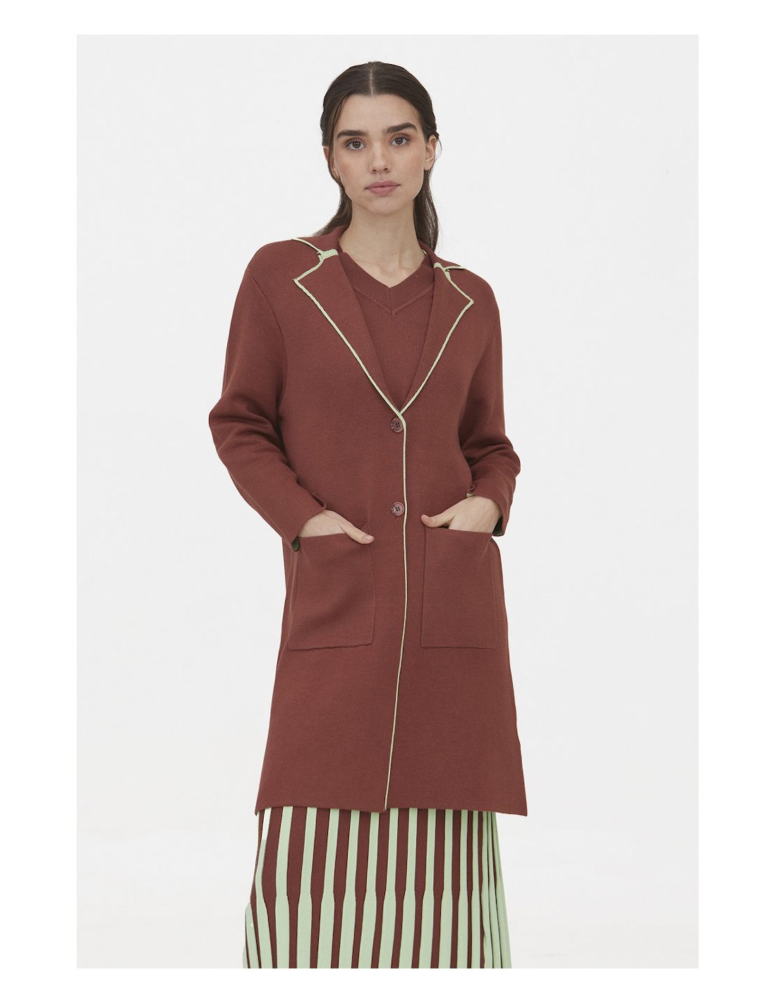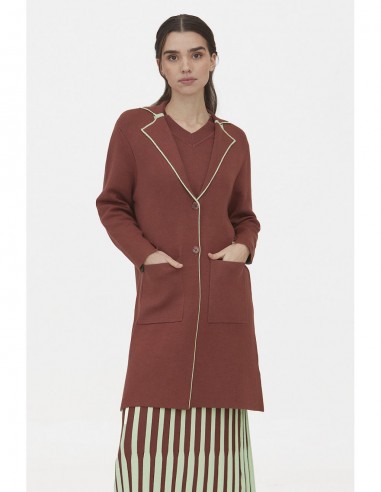 Abrigo de punto con cuello solapa abotonado en la parte delante con dos botones. Bolsillos en ambos lados visibles en la parte frontal. Tiene como detalle en los reversos de las solapas y cuello además de una fina tira en el frontal del abrigo y el interior un cambio de color a lima.