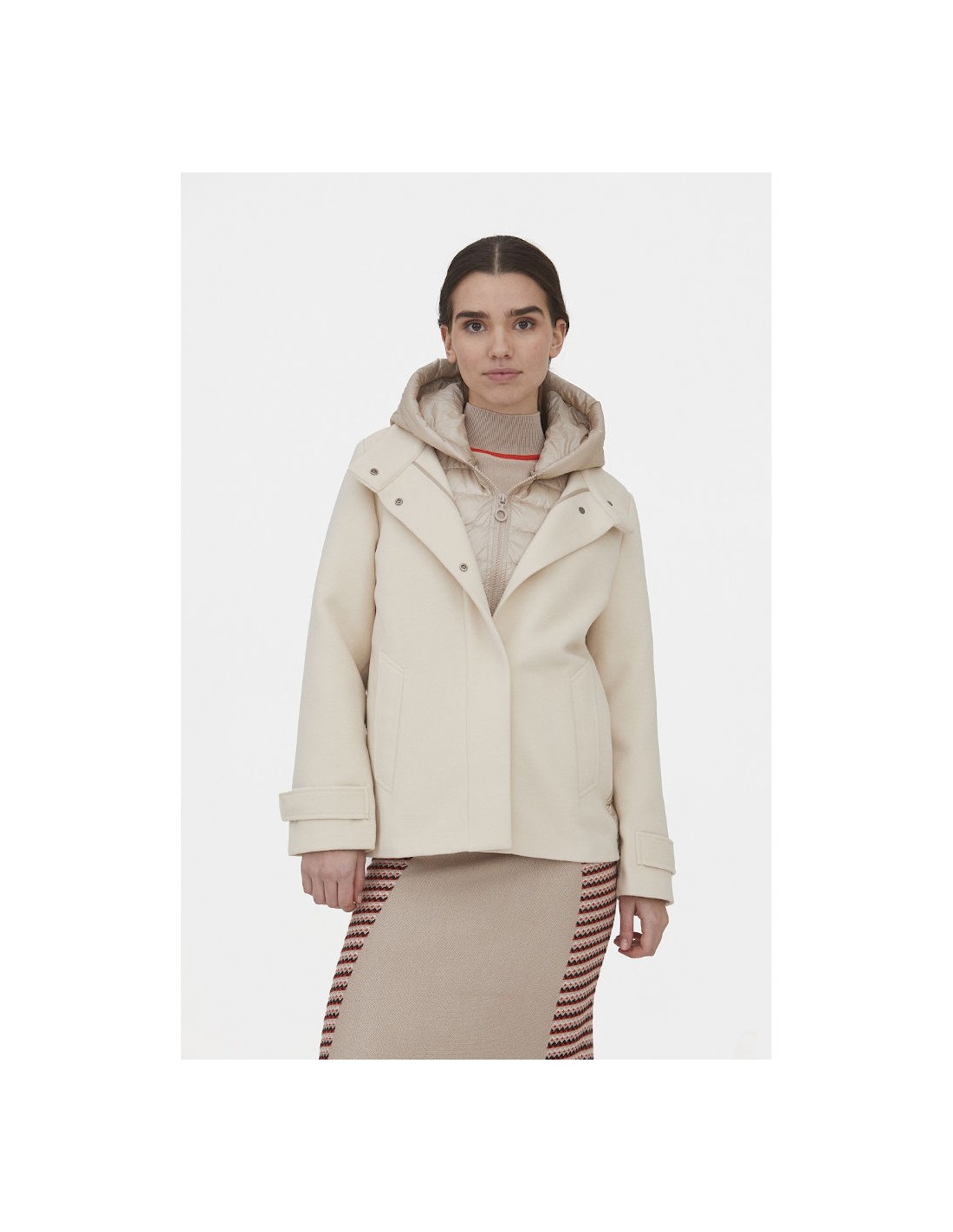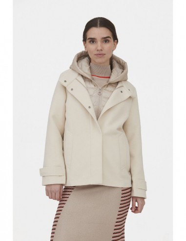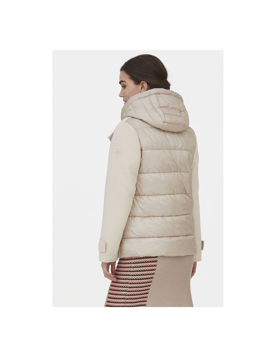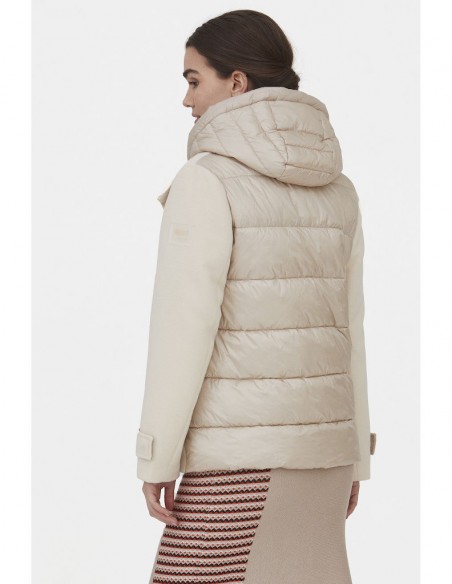 Parka combinada con acolchado y paño. La parte delantera compuesta por paño con bolsillos en delante.