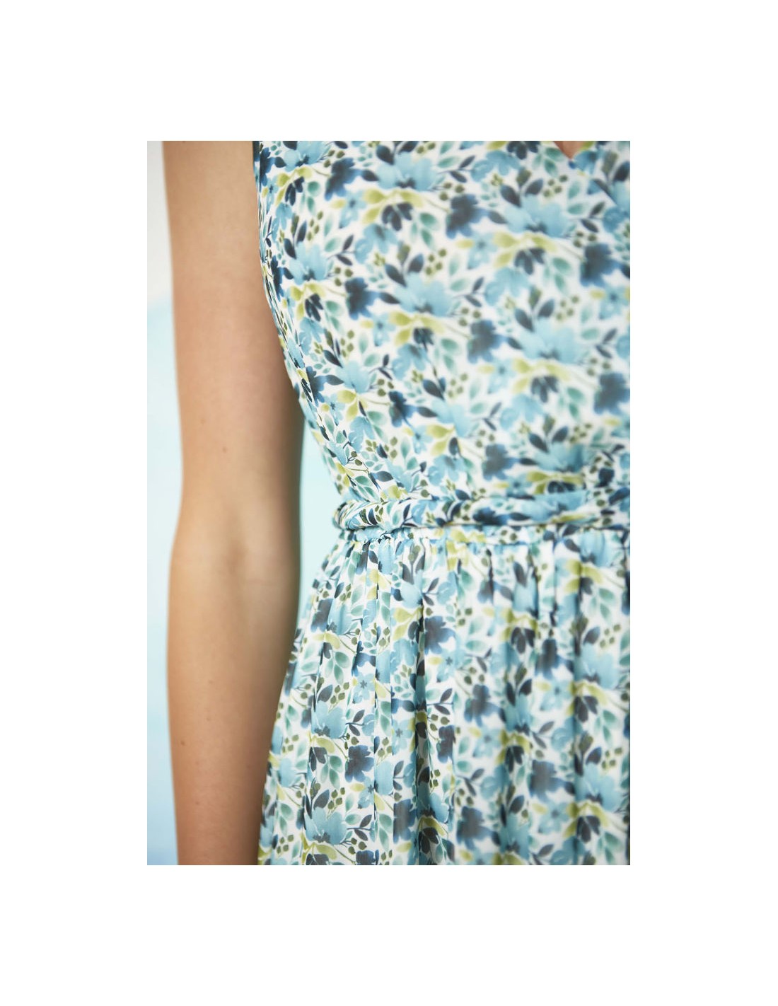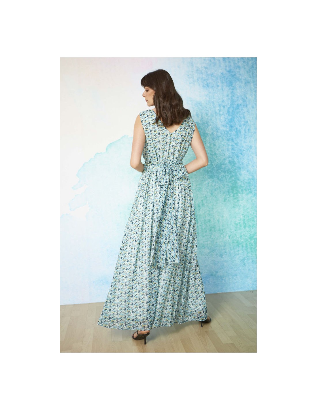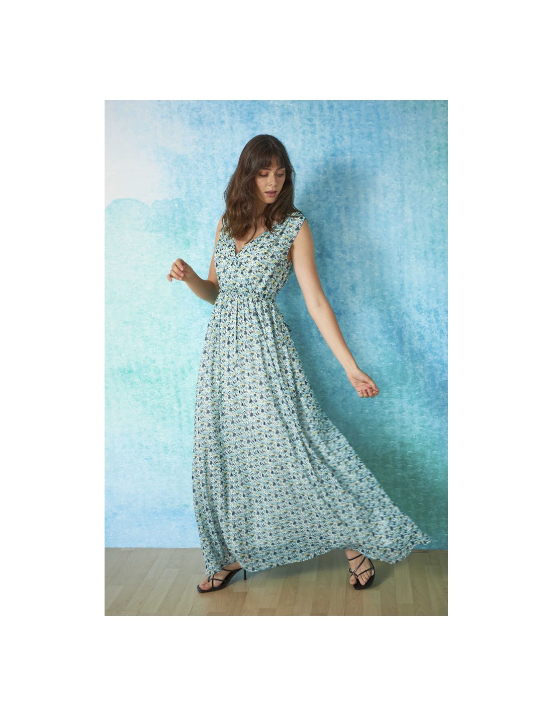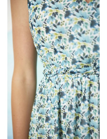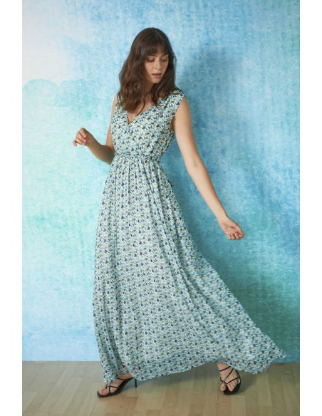 Vestido largo con escote cruzado y estampado floral en tonos azul y verde.