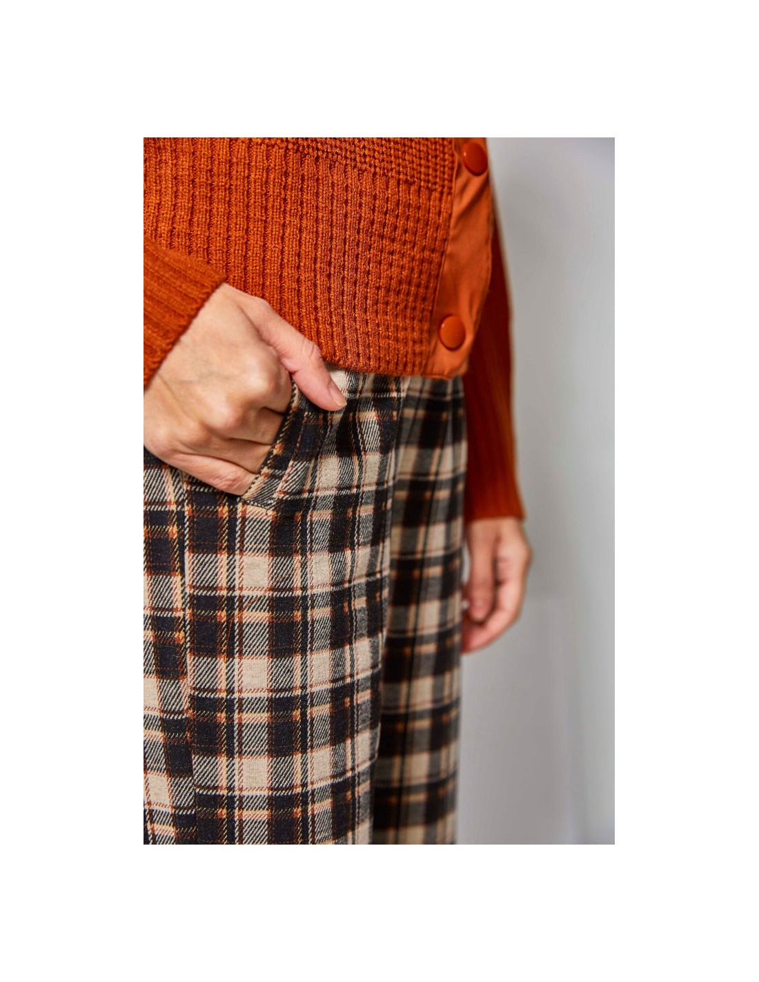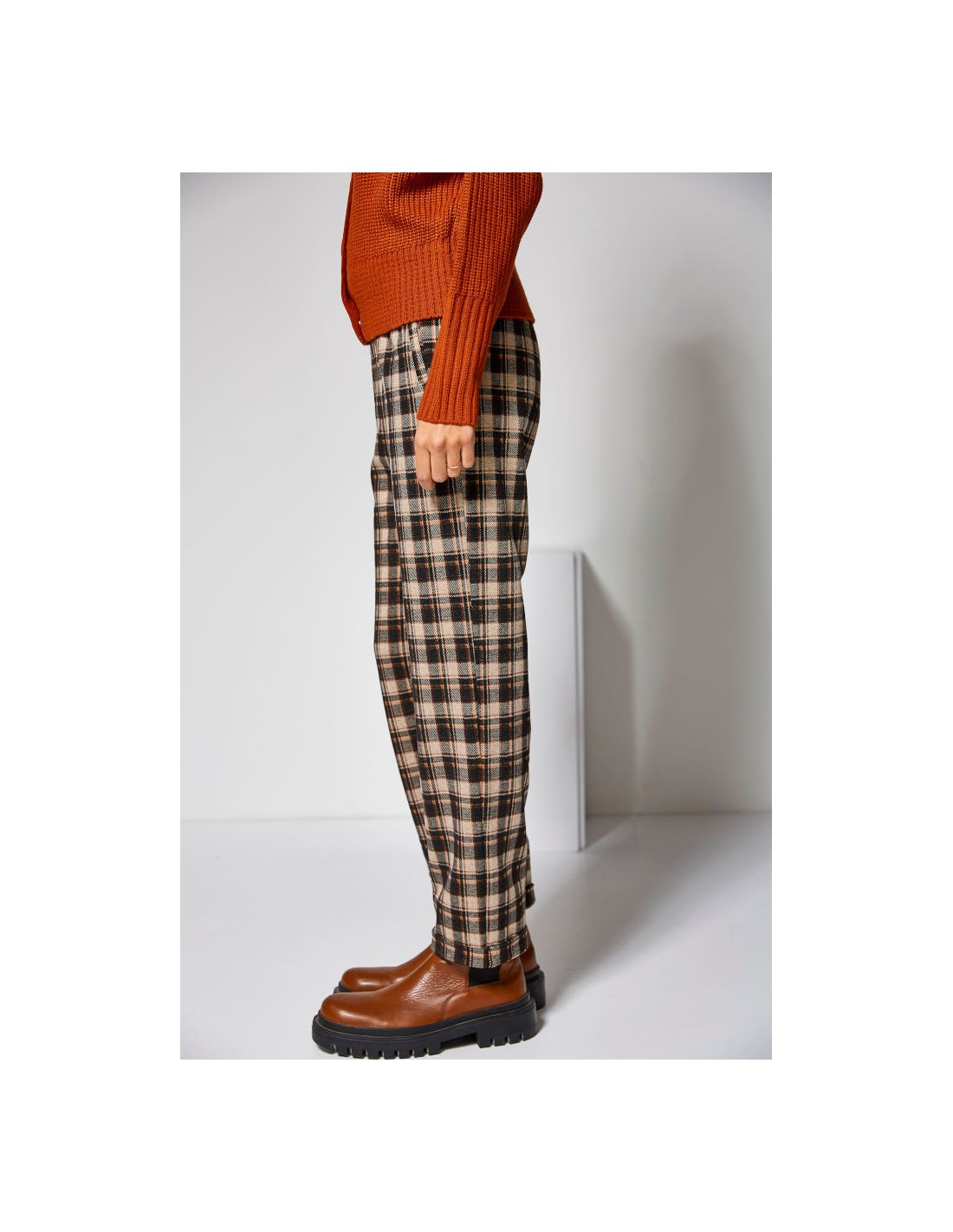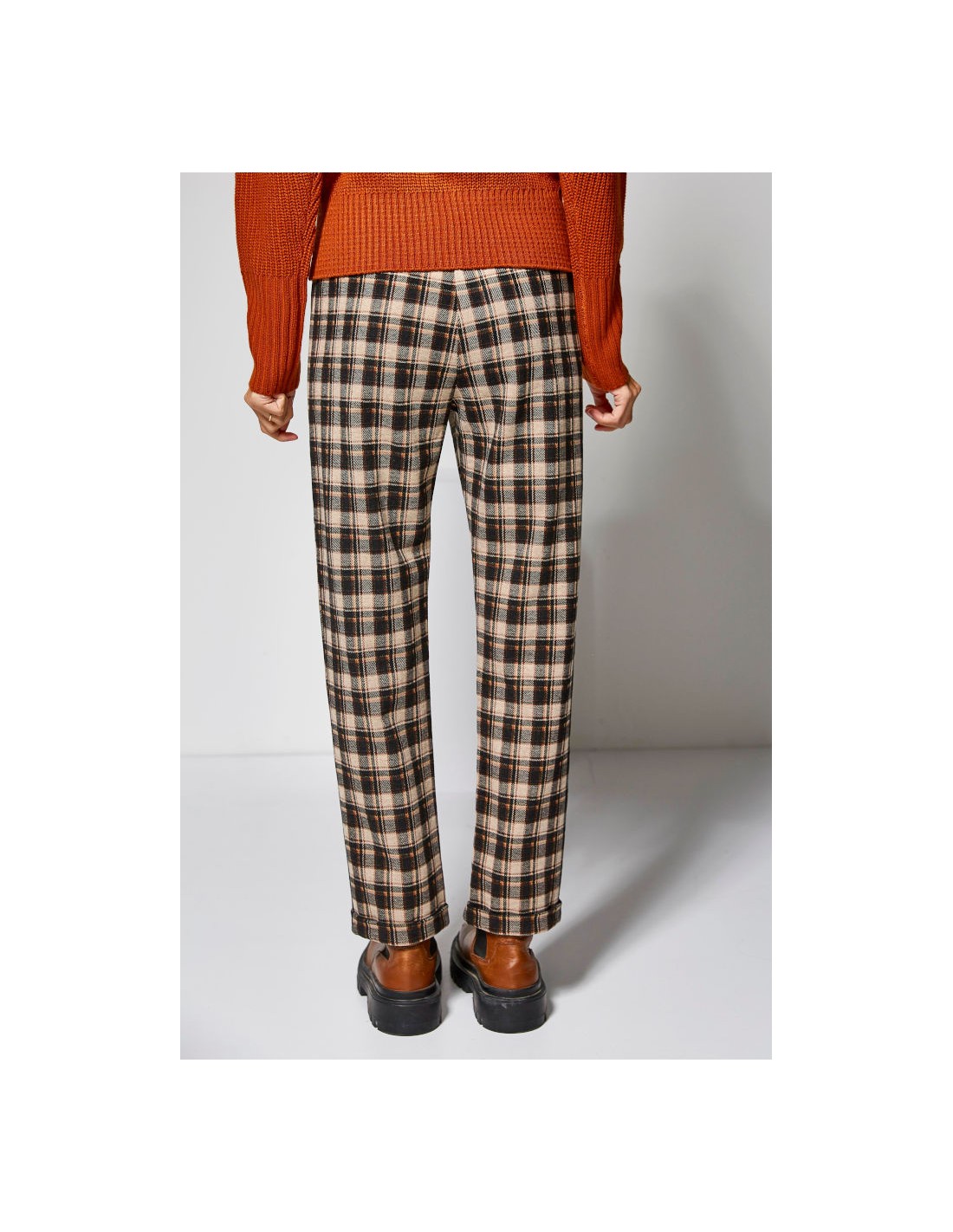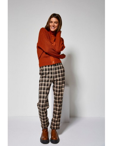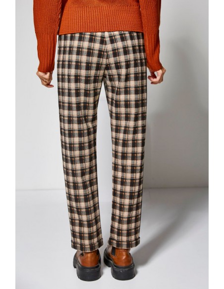 Pantalón de cuadros de tejido grueso aterciopelado con vuelta en el bajo y goma en la cintura.