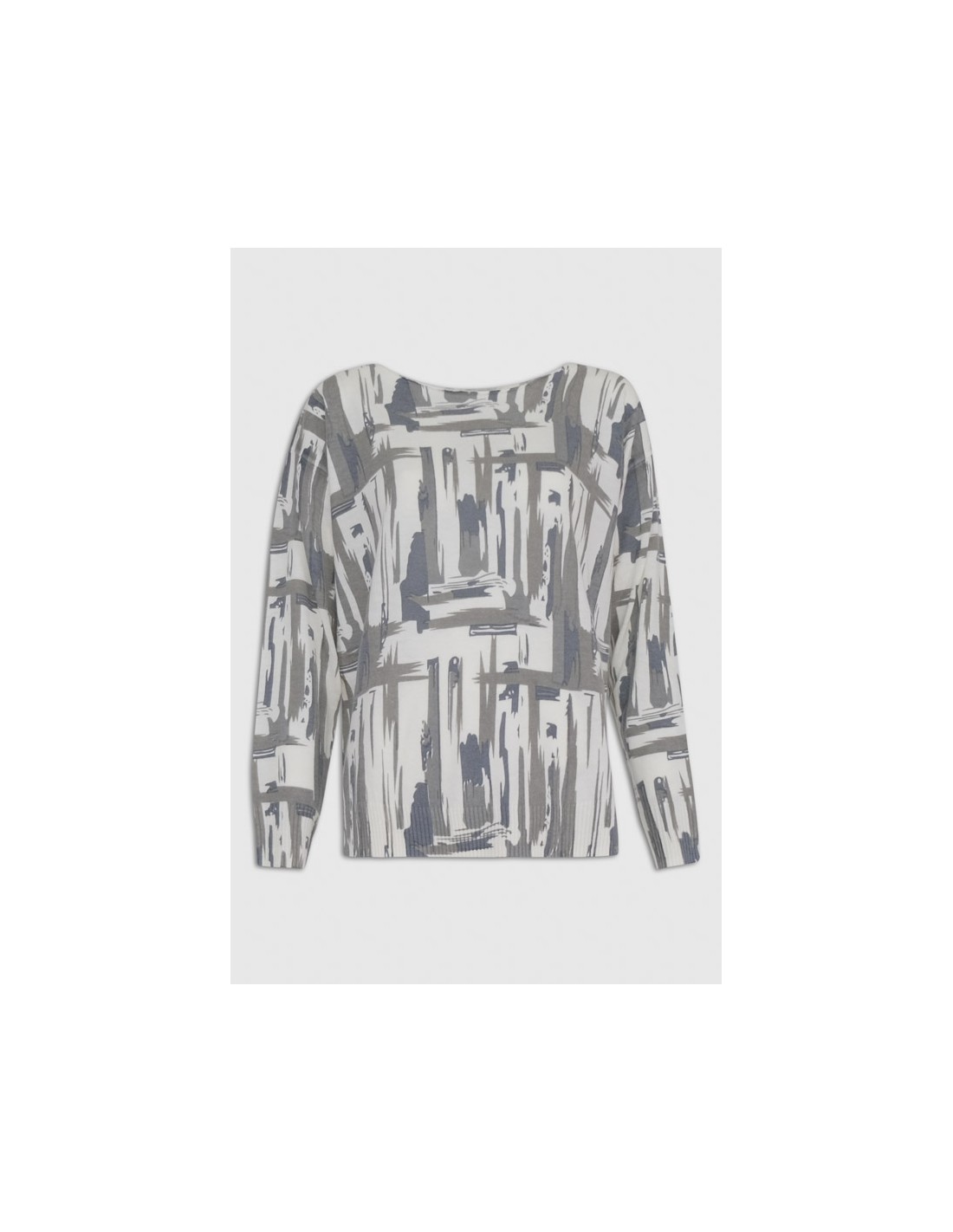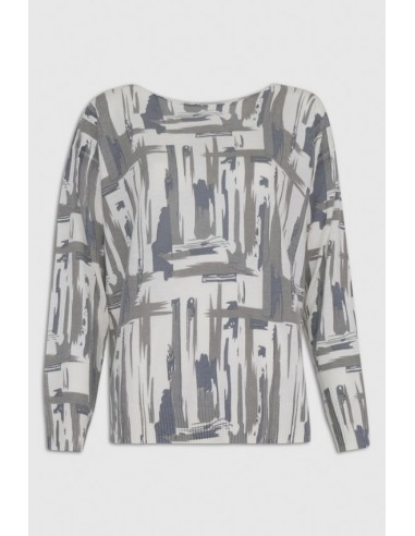 Jersey estampado de cuello redondo. Lleva dos pequeñas aperturas en los laterales además la parte delantera es ligeramente más corta que la parte trasera que es un poquito más larga.