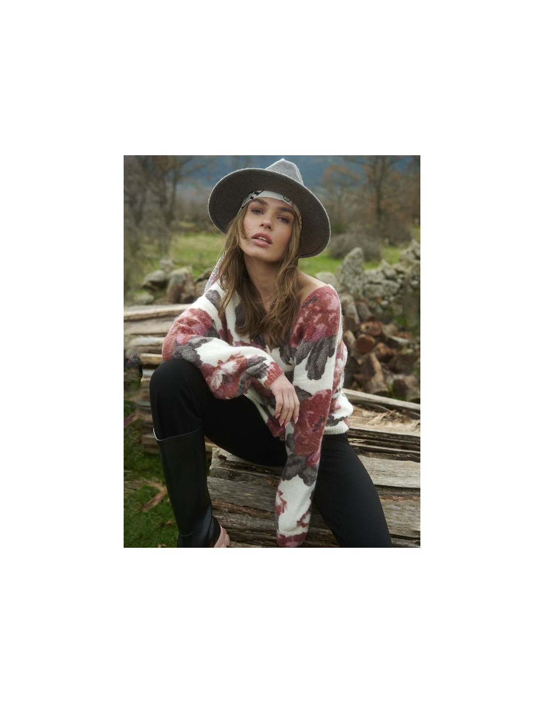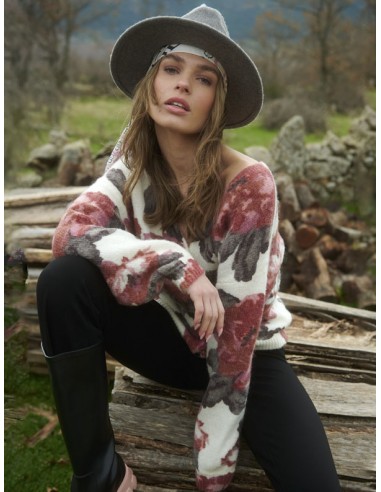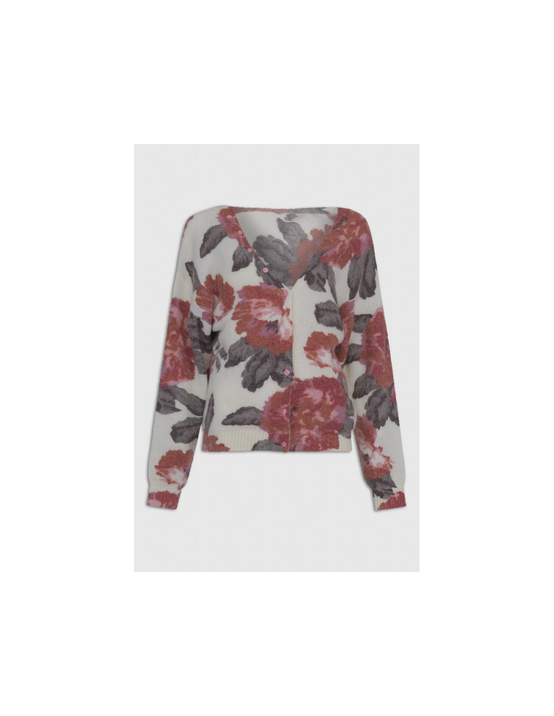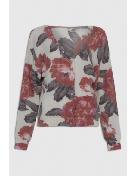 Jersey de punto con estampados florales y con detalle de botones funcionales en la parte delantera, que van desde el lado derecho del cuello hasta el bajo. Con escote a pico.