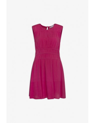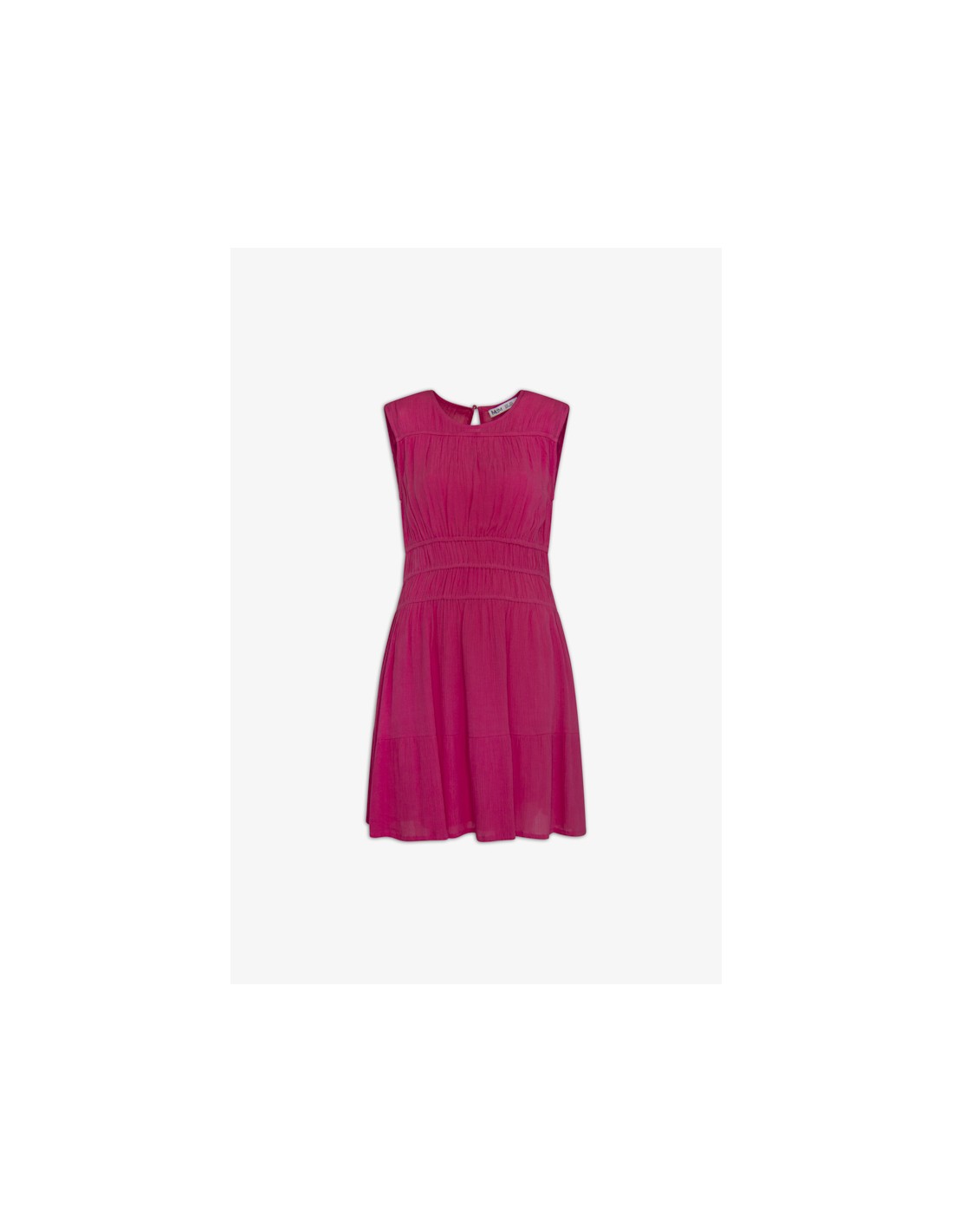 Vestido corto de tirante ancho. Tiene detalle de gomas por encima del pecho y espalda, por debajo en la zona de la cintura para un mejor ajuste del vestido. Lleva dos bolsillos laterales y un volante en el bajo. En la zona de la alta espalda tiene un pequeña abertura que cierra con un botón. Escote redondo. Tiene forro. Tela de efecto arrugado.